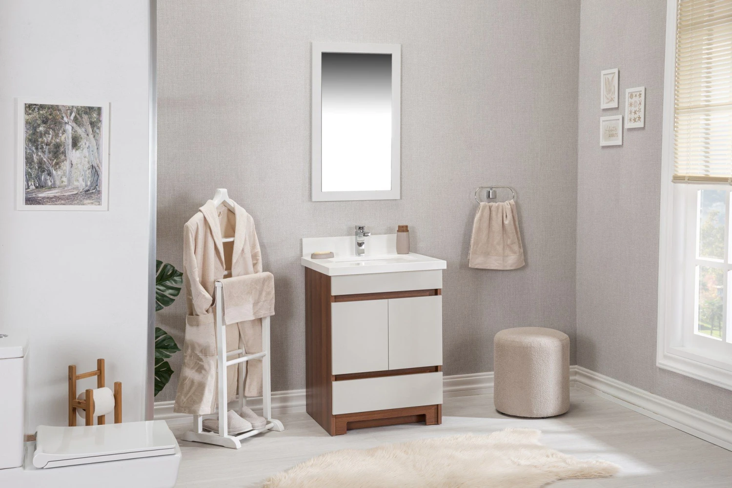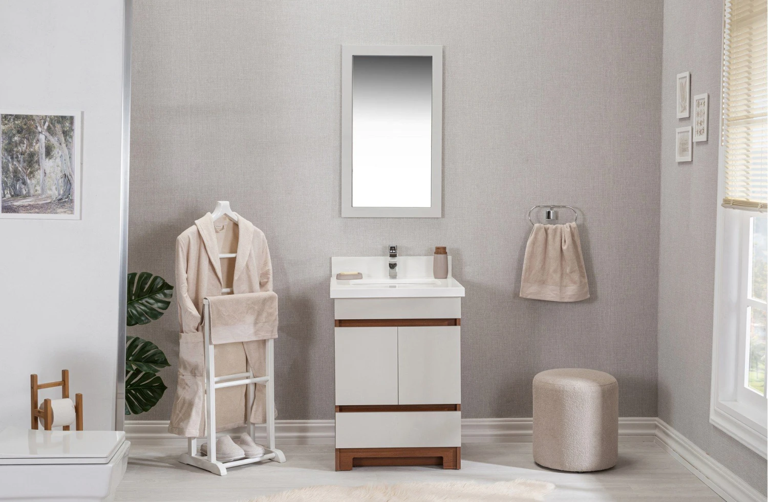 Jussara badkamermeubelset: 100% MDF met melaminecoating, kwarts aanrechtblad en porseleinen wastafel. Inclusief spiegel. Creme kleur