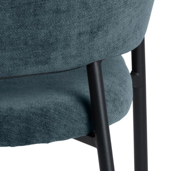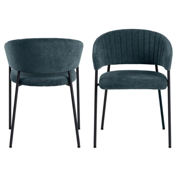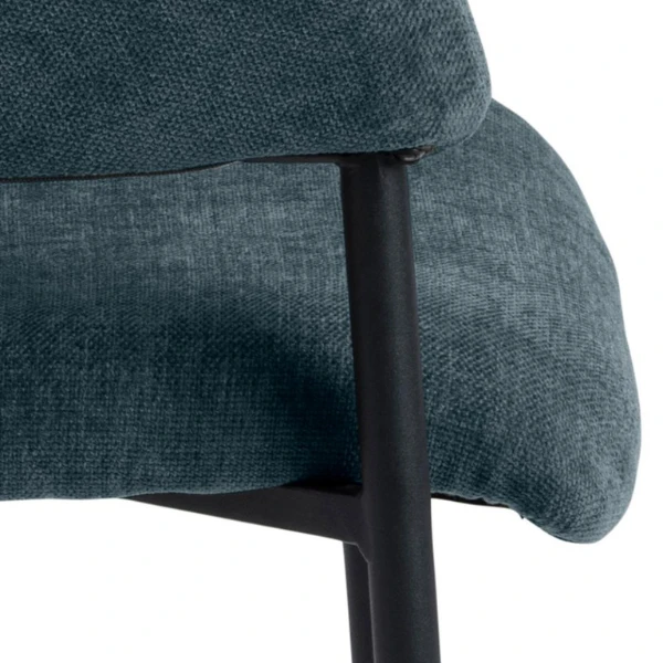 Armstoel Ann is voorzien van verticale stiksels en bekleed met donkerblauwe stof. Opgelet: Officieel is deze stof donkerblauw, maar in de realiteit is deze kleur eerder een mengeling van groen en blauw. Gelieve hiermee rekening te houden bij uw aankoop. De bekleding van deze stoel is scheur- en slijtvast en voelt zacht en warm aan. Het onderstel van de stoel bestaat uit 4 robuuste poten uit zwart gepoedercoat metaal.