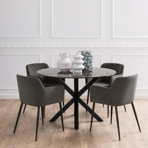 Armstoel Karen past door zijn donkergrijze bekleding en zijn zwart gepoedercoate poten uit metaal goed in een industrieel of modern interieur. Door de stoel te combineren met een tafel die een marmeren tafelblad en een spinnenpoot heeft, kun je een klassevol geheel creëren zonder dat je hierbij aan comfort moet inboeten. Armstoel Karen wordt per 2 verkocht.