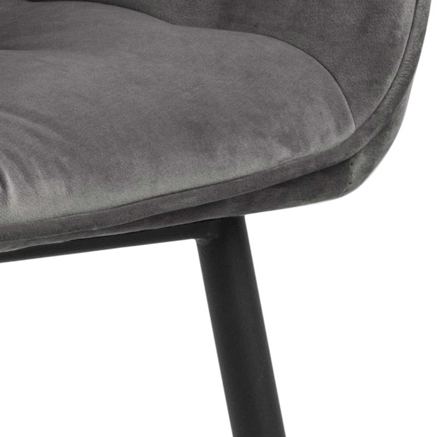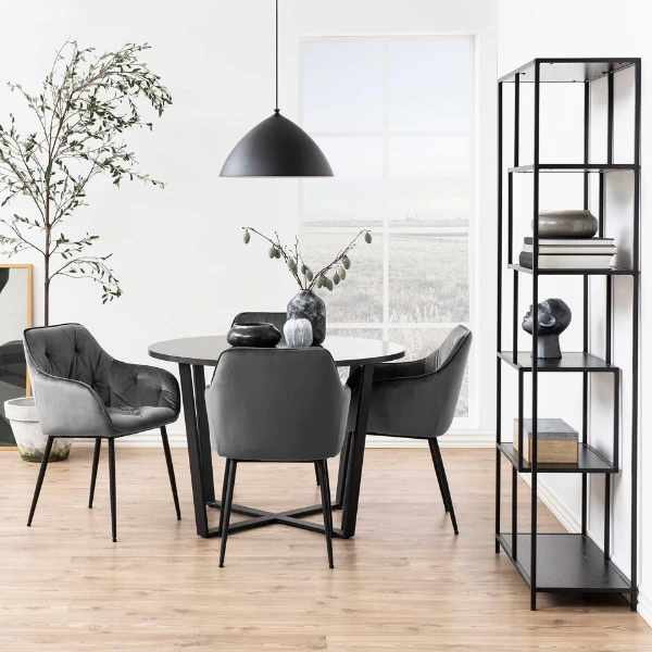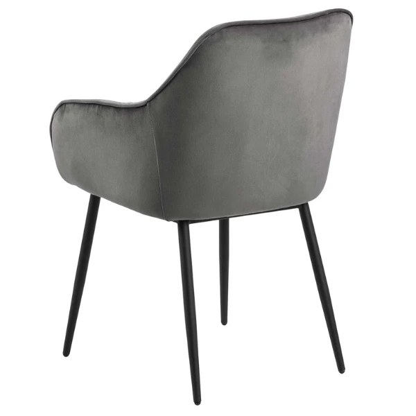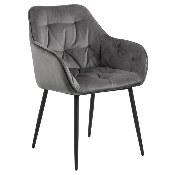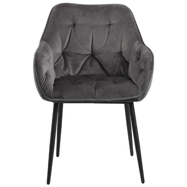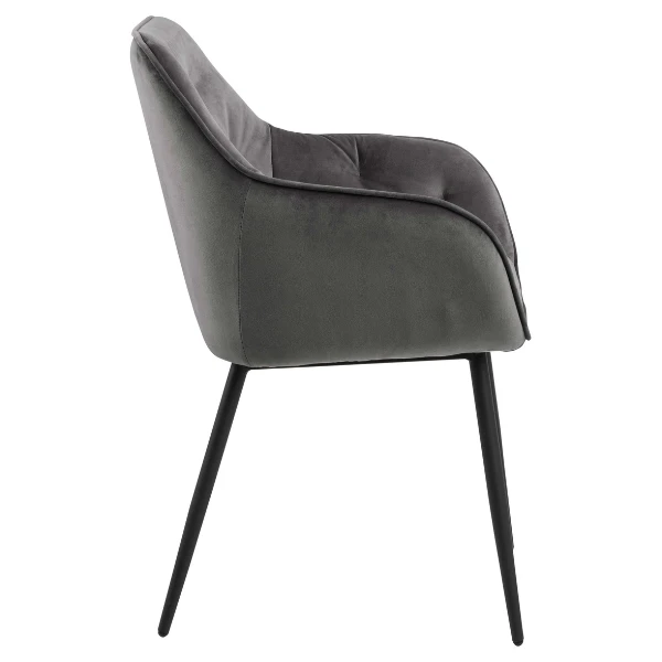 Deze gestoffeerde Lynn stoel met armleuningen is bekleed met donkergrijs fluweel en geeft een chique en luxueuze uitstraling aan je eetkamer. Tegelijk zorgen de mat zwarte poten uit gepoedercoat metaal voor een stoere toets. De armstoel is beschikbaar in verschillende trendy kleuren.