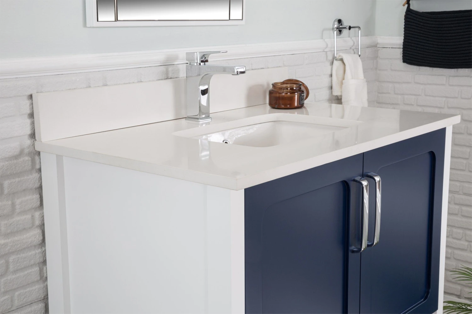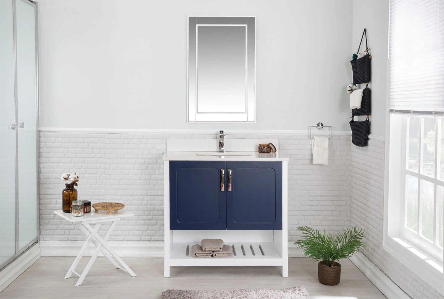 Jussara-badkamermeubelset bestaat uit een donkerblauw badmeubel met een breedte van 90 cm, een 100% gelakte MDF-constructie en een 100% wit kwartsblad met een porseleinen onderbouwwastafel. Er zit ook een spiegel bij van 55cm x 80cm.
