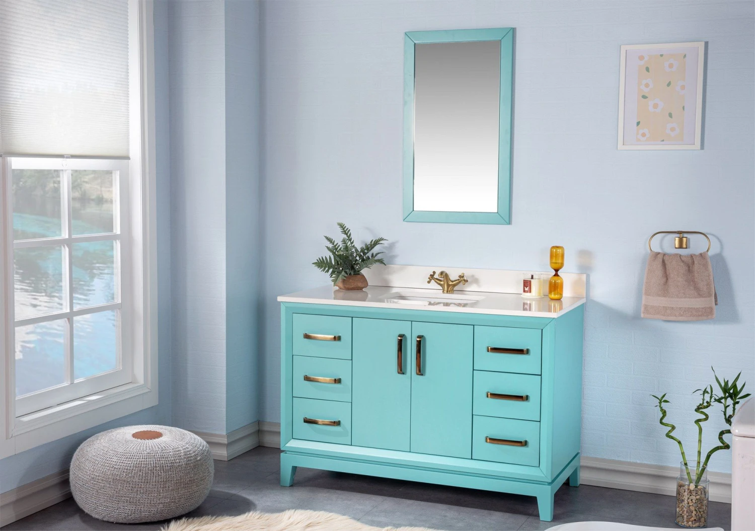Inbegrepen in de set is een flotale spiegel die een vleugje verfijning toevoegt aan je badkamer. De spiegel meet 55 cm in de breedte en 80 cm in de hoogte, waardoor er voldoende reflectieruimte is. De turquoise kleur van de spiegel is een aanvulling op het algemene ontwerp van de set en voegt een vleugje kleur en uniciteit toe aan je badkamerinrichting.