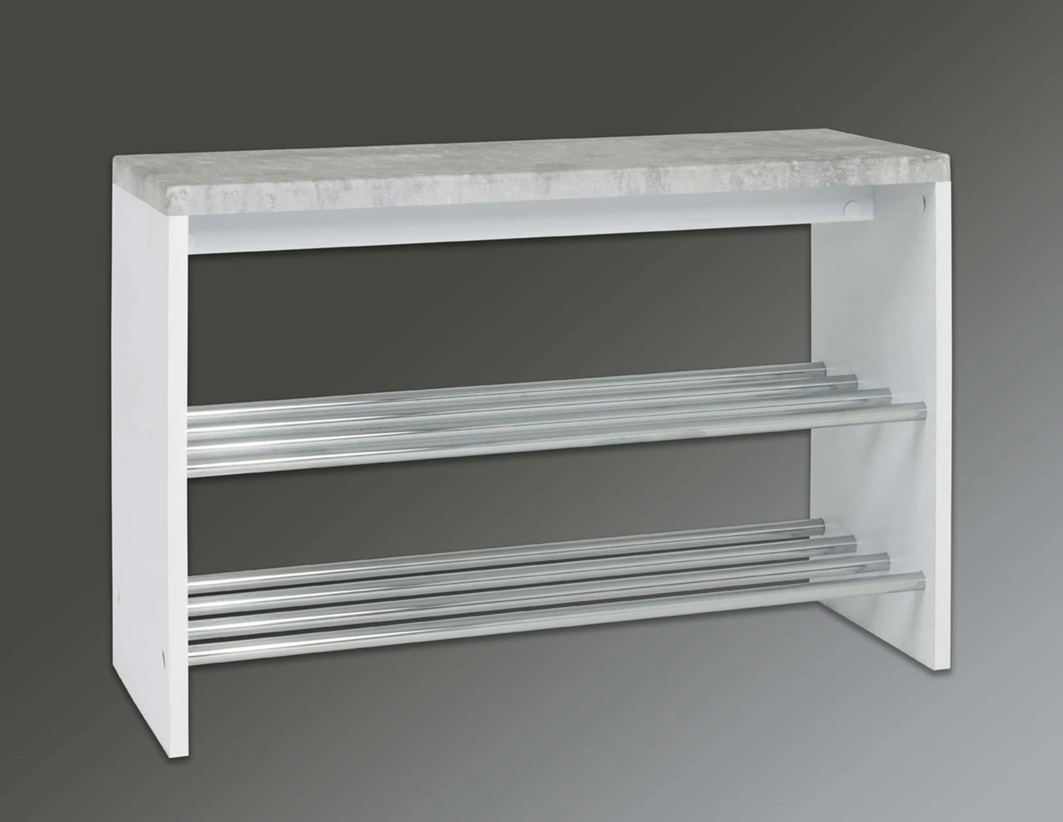 Bank Tillio, gemaakt uit MDF in het wit en met een beton decor. Uitgerust met twee rekken uit chroomkleurig metaal.