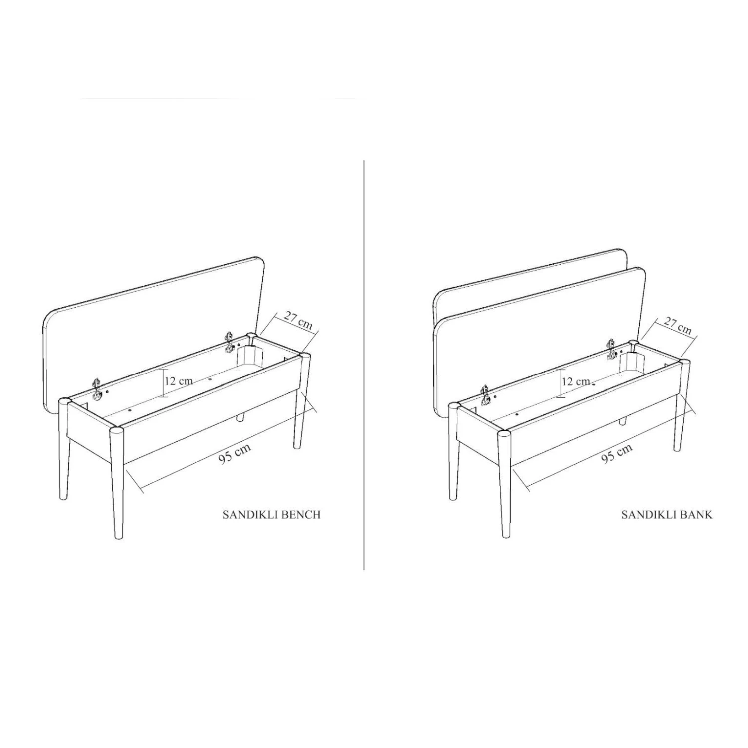 De bank Vella is gemaakt van 100% gemelamineerd spaanplaat van hoge kwaliteit, met linnen stof, haagbeuken poten en een ruim opbergmeubel. De witte en donkerblauwe kleur voegen een modern tintje toe. Afmetingen: 110 x 40 x 48 cm.