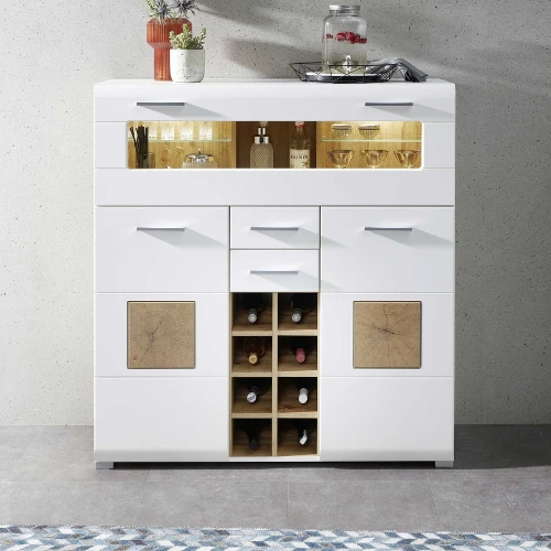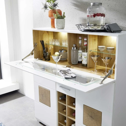 Barmeubel Felice 120x37x129cm uit MDF met mat witte afwerking en houtlook accenten. Met twee deuren, één opklapdeur, twee lades en ruimte voor acht flessen. Inclusief LED-verlichting.