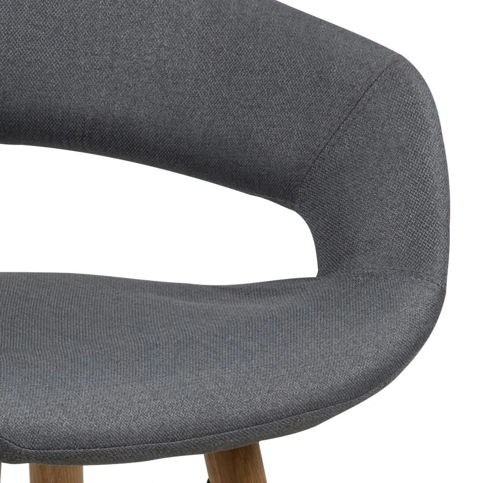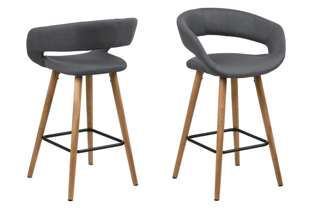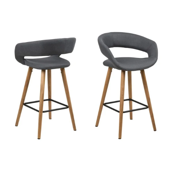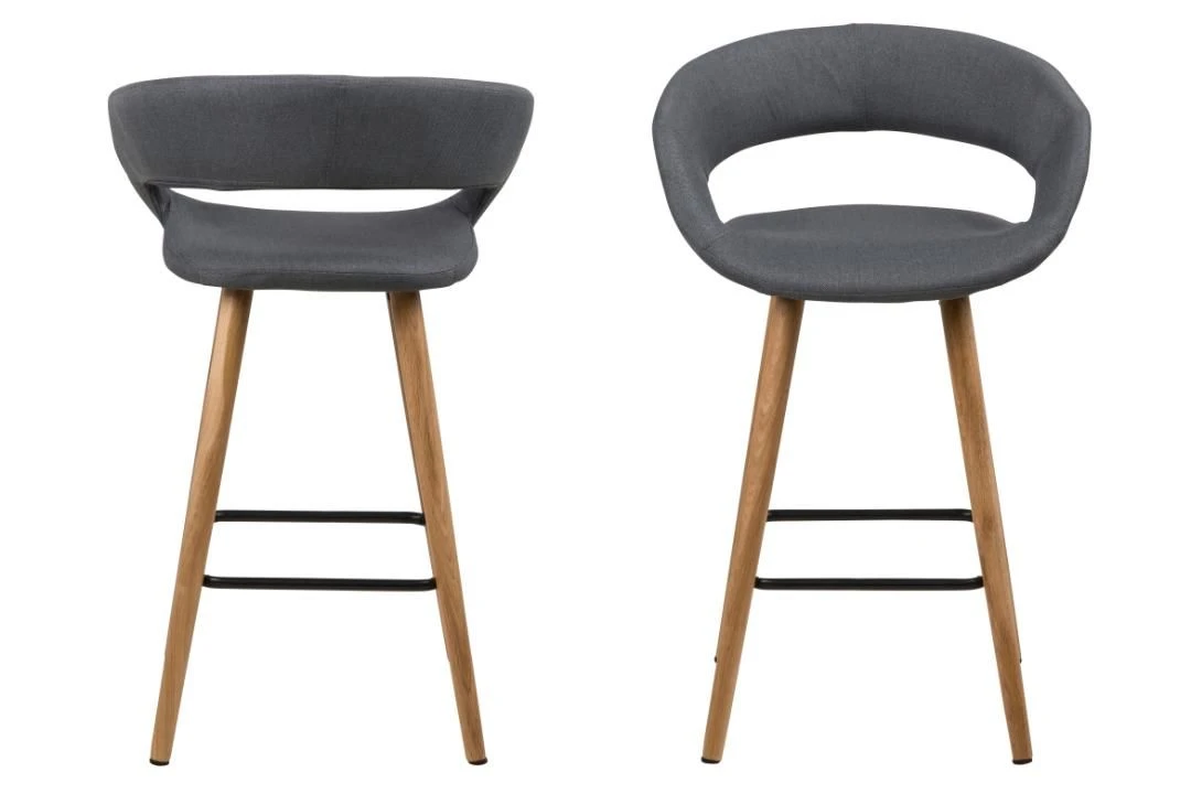 Deze barstoelen van de Dusty-collectie zorgen voor een trendy toets in je interieur. De stoel heeft een originele zitting die is overtrokken met een grijze stof, en poten uit massief eikenhout met een voetsteun uit zwart gepoedercoat metaal. Het leuk aspect aan deze barstoel is de ronde vorm in de rugleuning, wat de stoel een speciaal design bezorgt.