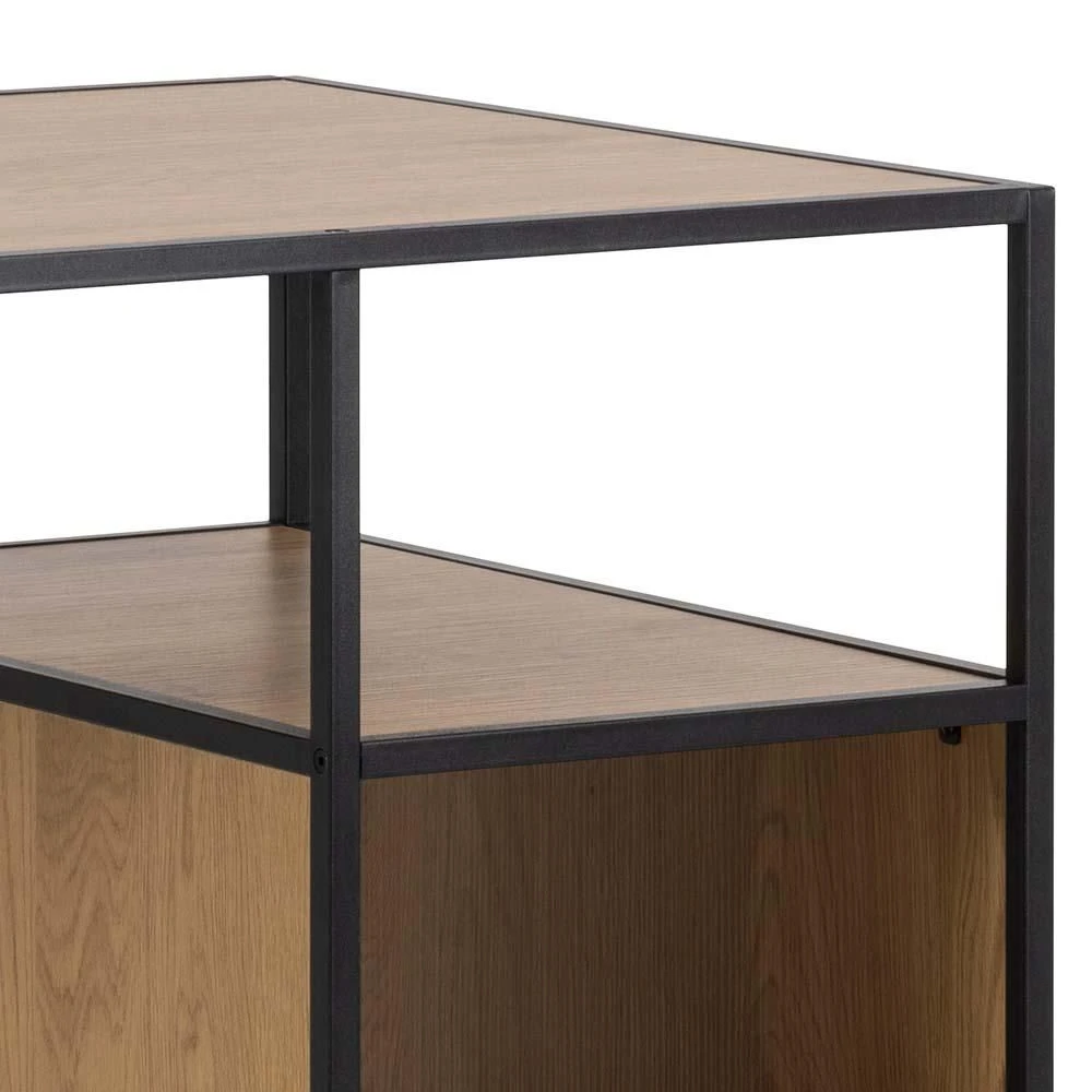 Bartafel Dover met open compartiment en legplank. Gemaakt uit zwart gepoedercoat metaal met een tafelblad uit wilde eik decor, 120x60cm.