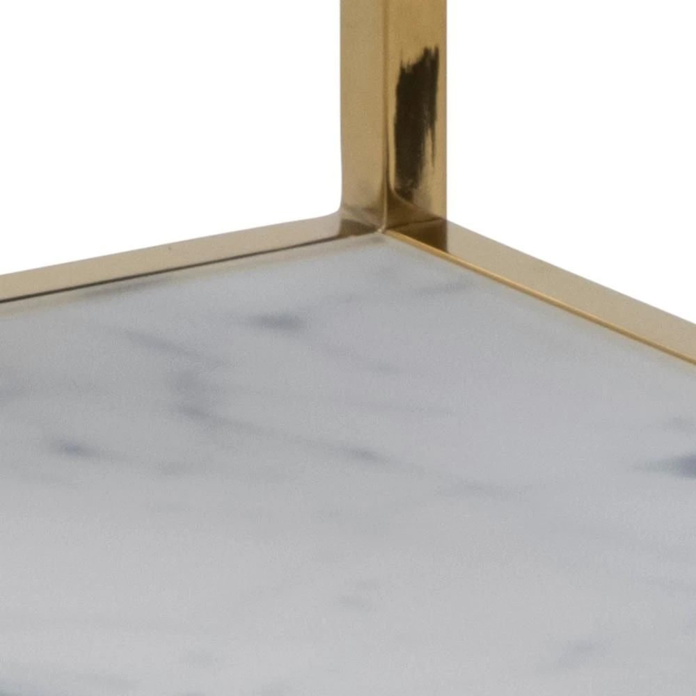 De Anika bijzettafel is ideaal om naast een bed of zetel te plaatsen. Deze bijzettafel is zeer praktisch dankzij haar extra legplankje. Je kan gemakkelijk een lampje, kaars of plant op het tafelblad plaatsen en boeken of magazines op het legplankje leggen. Deze bijzettafel is gemaakt uit kunstmarmer in het wit met gouden poten.