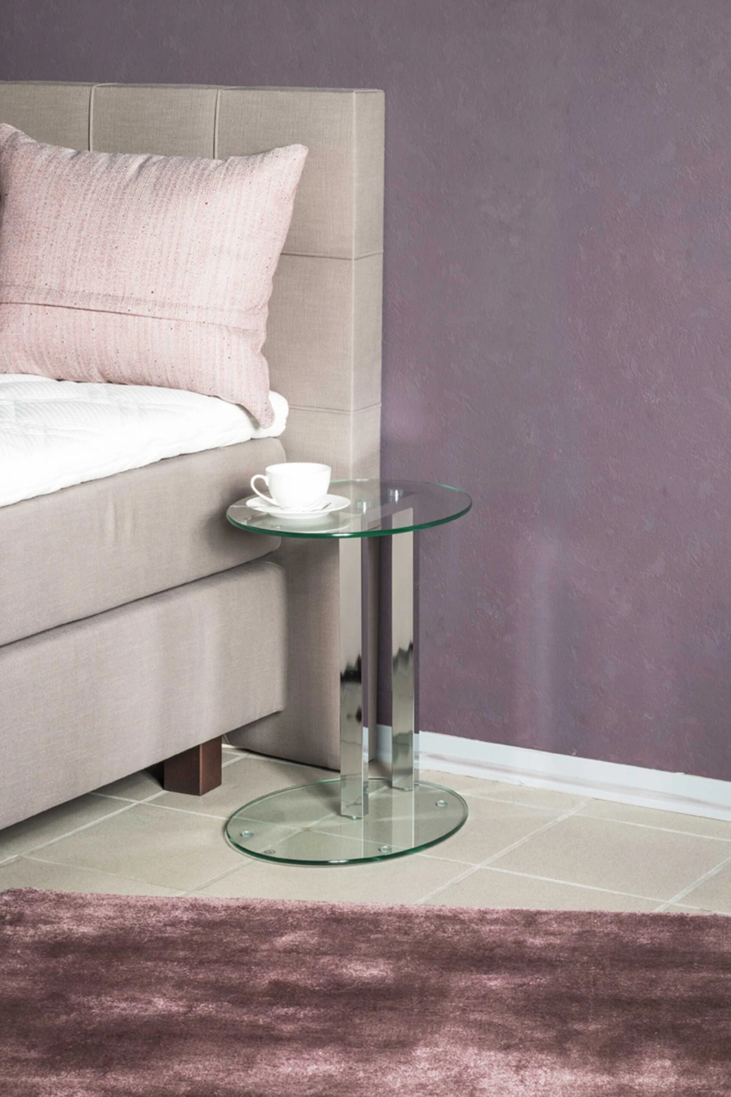 Ovalen bijzettafeltje Romelu, samengesteld uit een stalen frame in chroomoptiek, tafelbladen uit veiligheidsglas.