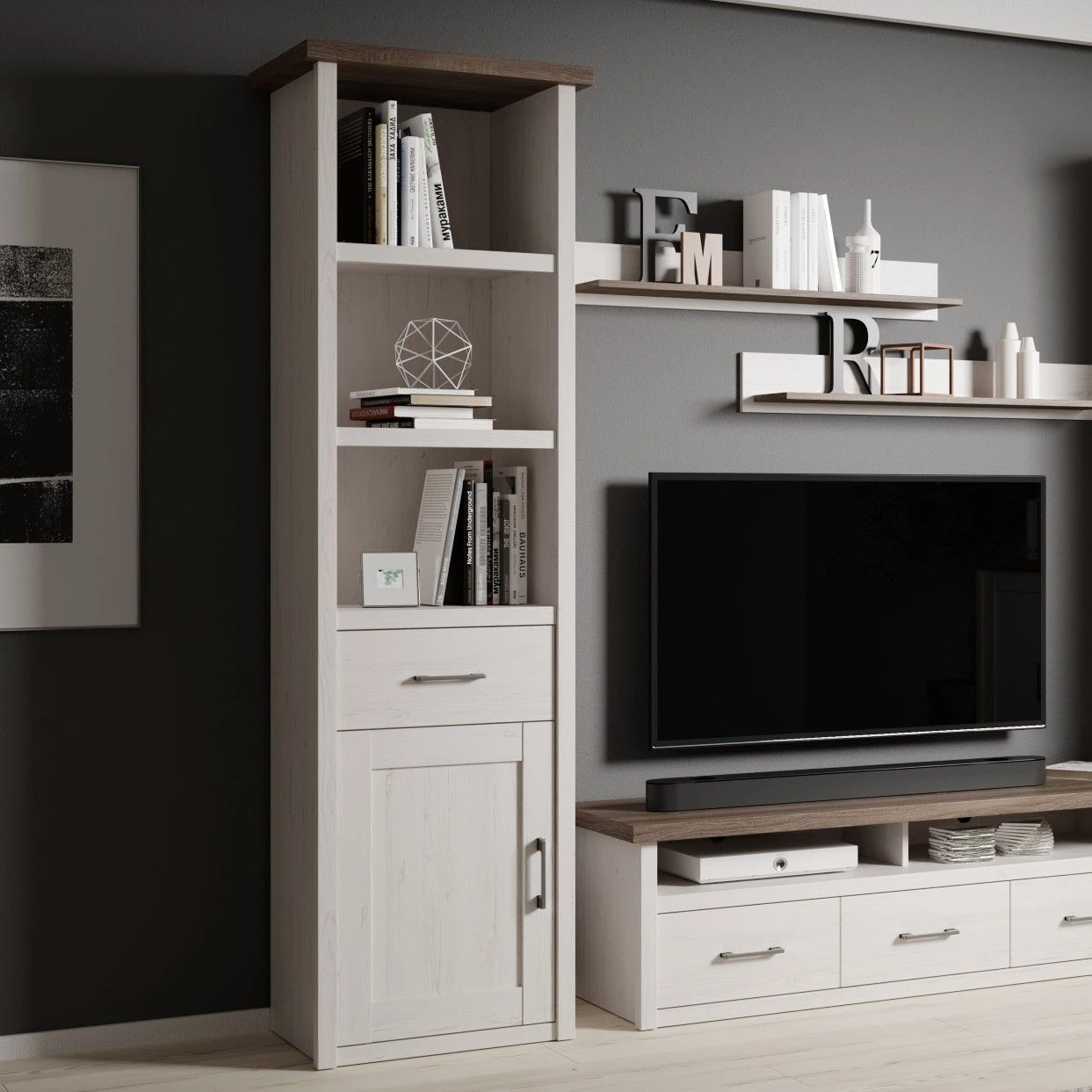 Multi-inzetbare boekenkast Larnaca, gemaakt uit gefolieerde spaanplaat in pijnboomdecor en accenten in truffelkleur. De kast is uitgerust met 3 open vakken, een lade en een draaideur.