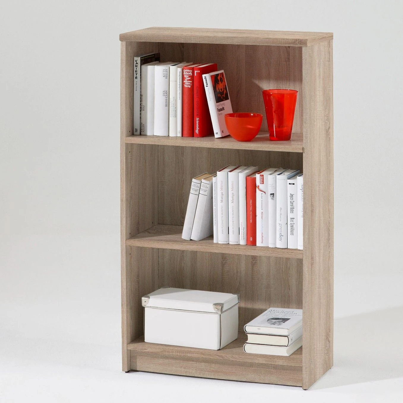 Dit compacte meubel is een moderne invulling van een boekenrek. Het meubel is praktisch, aangezien je het overal in je huis kan plaatsen. Het sonoma eikdecor van de gebruikte spaanplaat geeft een moderne aanblik. Je kan op de beide legplanken, naast je favoriete boeken, op een overzichtelijke manier accessoires zoals fotokaders of kommen wegbergen. Een handig meubel voor een klein prijsje!