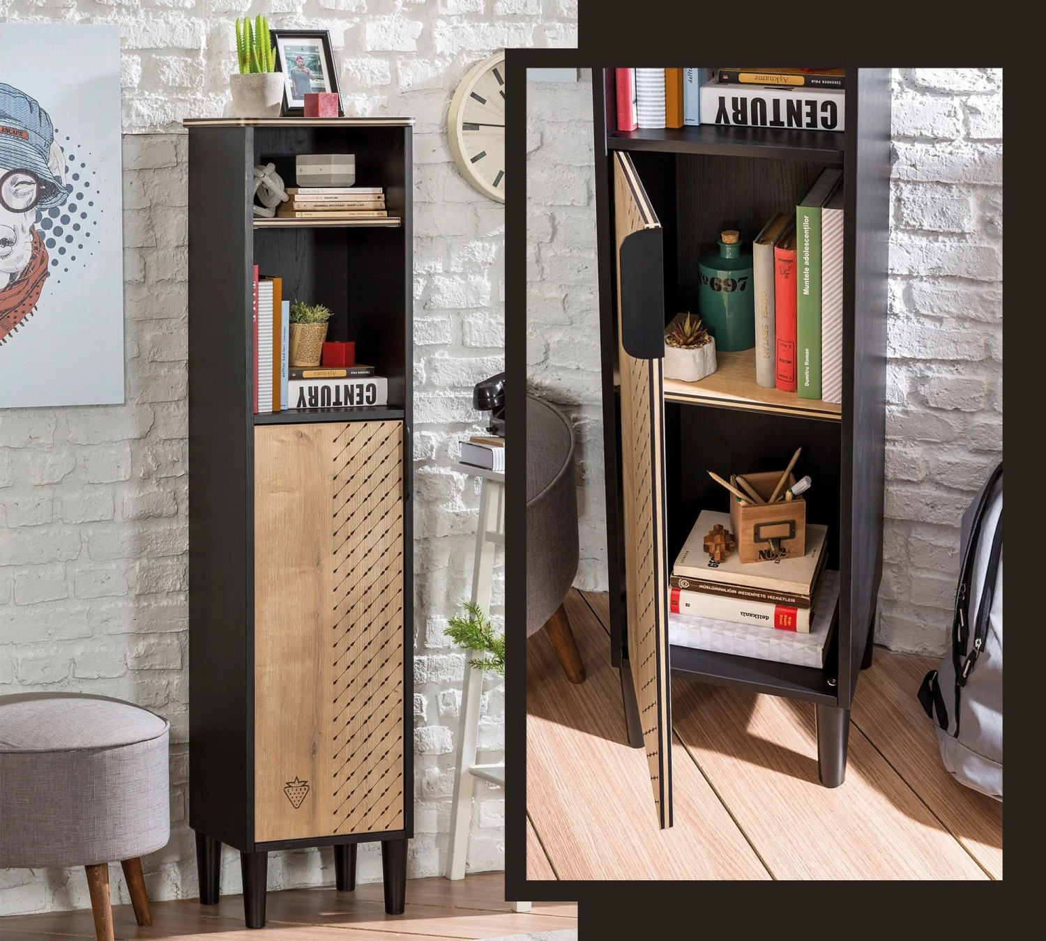 Boekenplank: 18 mm dik, 34 cm breed, 146 cm hoog en 29 cm diep. Meerdere planken, deurtjes die zachtjes sluiten en aan de muur te bevestigen. Kindvriendelijke materialen, zelf te monteren met instructies. Series: Zwart, Veelkleurig