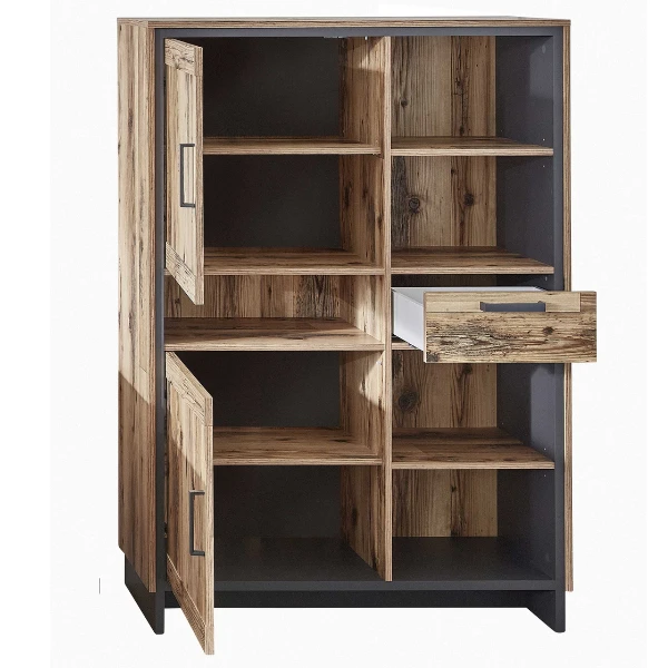 Buffetkast Delano 100x38x145cm uit spaanplaat met afwerking in houtlook en antraciet. Met twee deuren & één lade.