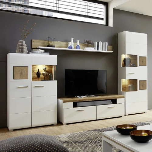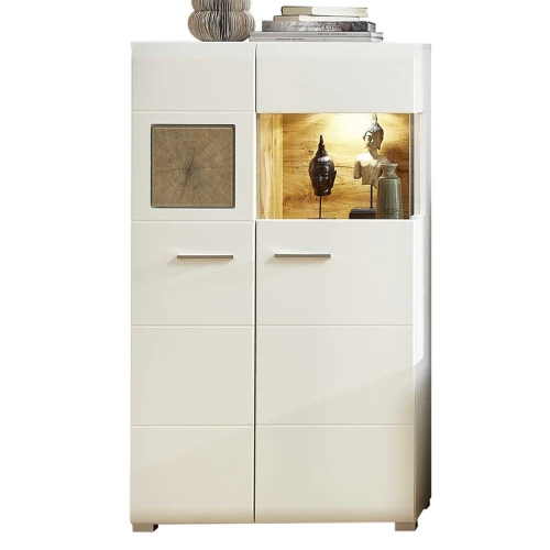 Buffetkast Felice 80x37x139cm uit MDF met mat witte afwerking en houten accenten. Met twee deuren en ingebouwde LED-verlichting.
