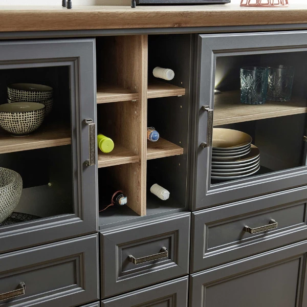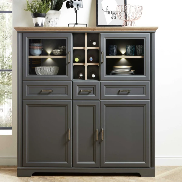 Ga voor de modern landelijke woonstijl met de meubelen van de Samine-reeks, die zijn gemaakt uit spaanplaat in grafietkleur en met afwerkingen in eikdecor. De reeks bestaat ook in het wit. Deze buffetkast beschikt over alle opbergruimte die je kan wensen. Onderaan vind je drie deurtjes, met daarboven telkens een lade. In het midden bovenaan vind je zes open vakken die geschikt zijn om bijvoorbeeld wijnflessen te bewaren. Daarnaast zijn twee glazen deuren waarachter je servies kan opbergen. Hiervoor is ledverlichting voorzien. Alle kasten beschikken over een soft-close systeem.