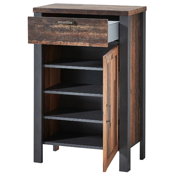 Richt je interieur in volgens de industriële woontrend met de collectie Carthago, gemaakt uit spaanplaat met een oud houtlook en metalen handgrepen. Achter de deur zijn drie legplanken voorzien, waardoor je plaats hebt voor 6 à 9 paar schoenen. Dankzij de lade kan je ook allerlei kleine spullen opbergen, zoals je sleutels of opladers. Combineer met de andere producten uit de reeks Carthago voor een mooi geheel.