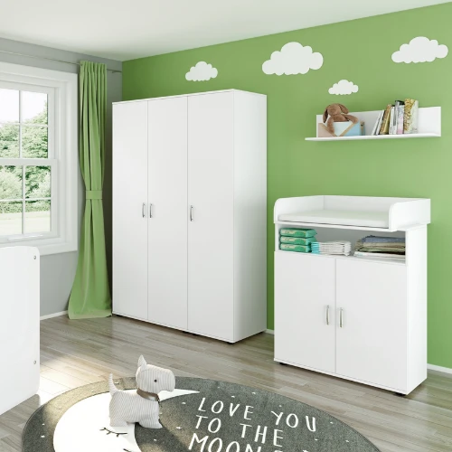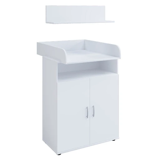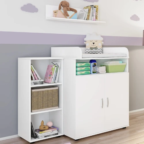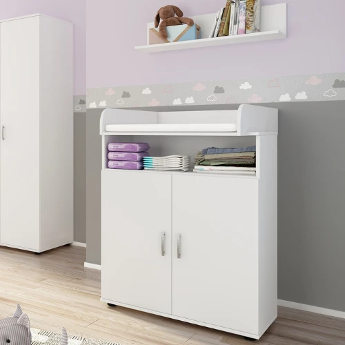 Commode Halula is gemaakt uit gemelamineerde spaanplaat in wit en bestaat uit een luierplank, open vak, 2 draaideuren, 1 legplank en 1 wandplank.