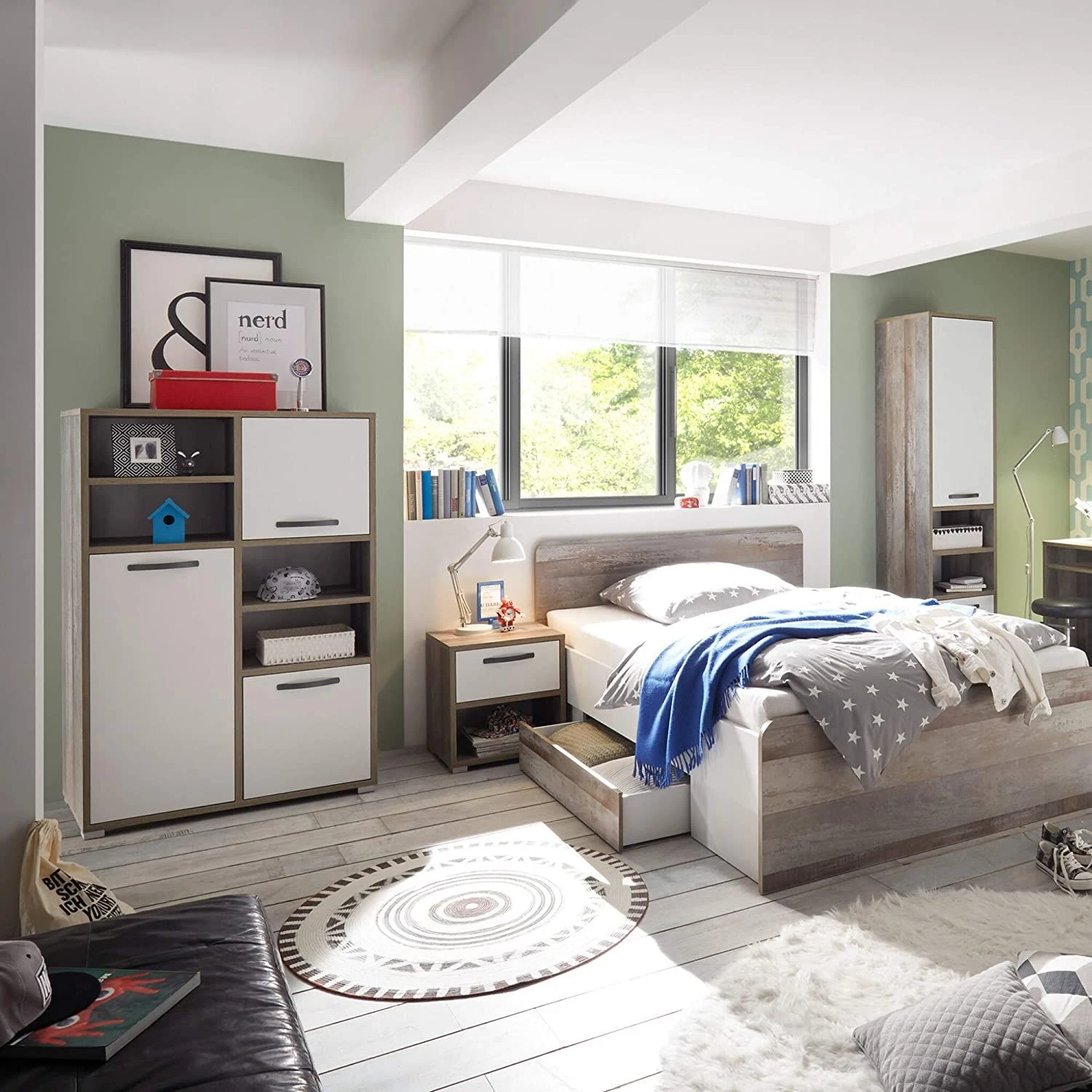 Commode Petrus met 3 deuren en 4 open opbergvakken, gemaakt uit spaanplaat in drijfhoutdecor met kastdeuren in wit en handgrepen met aluminiumlook.