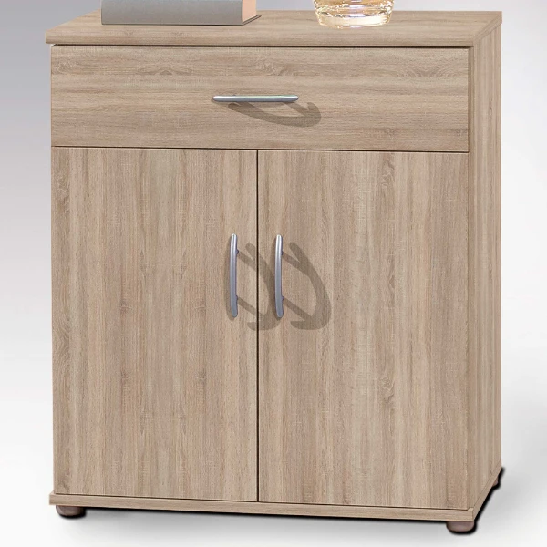 Commode Viviane 60x30x70cm uit spaanplaat met afwerking in eikdecor. Met twee deuren en één opberglade.