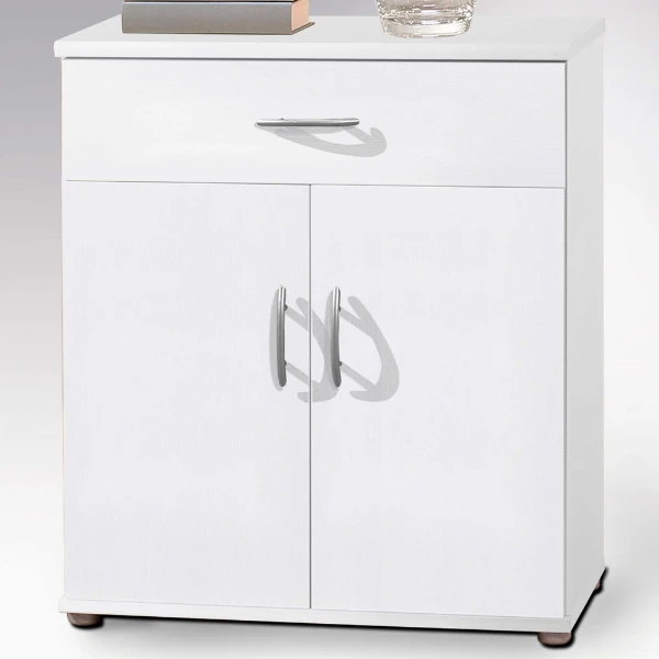 Commode Viviane 60x30x70cm uit spaanplaat met afwerking in wit. Met twee deuren en één opberglade.