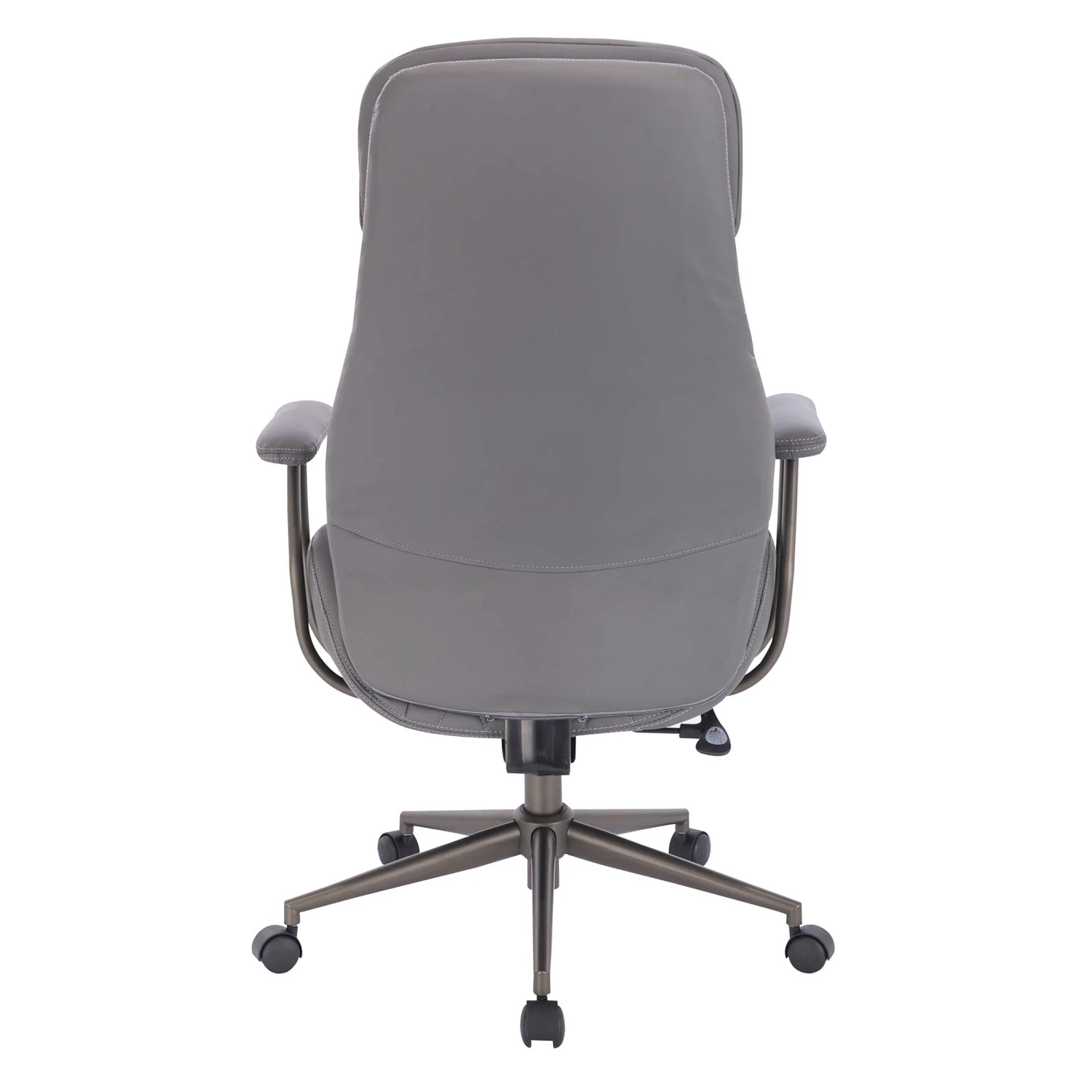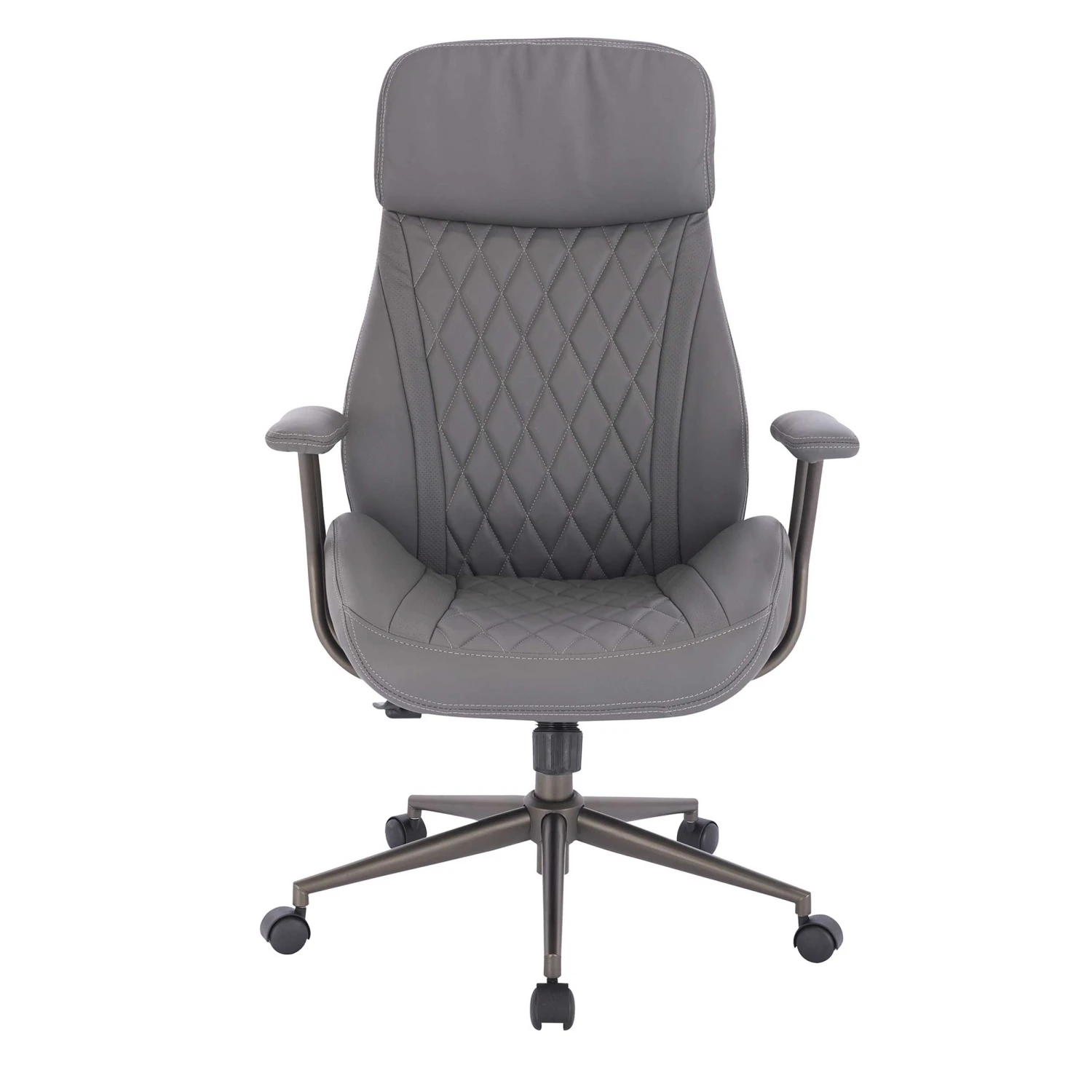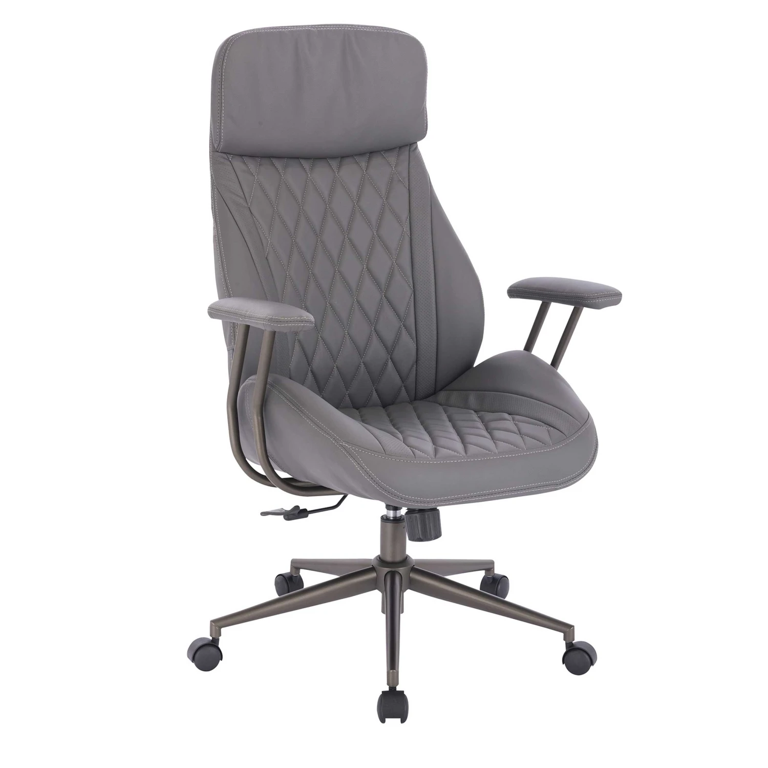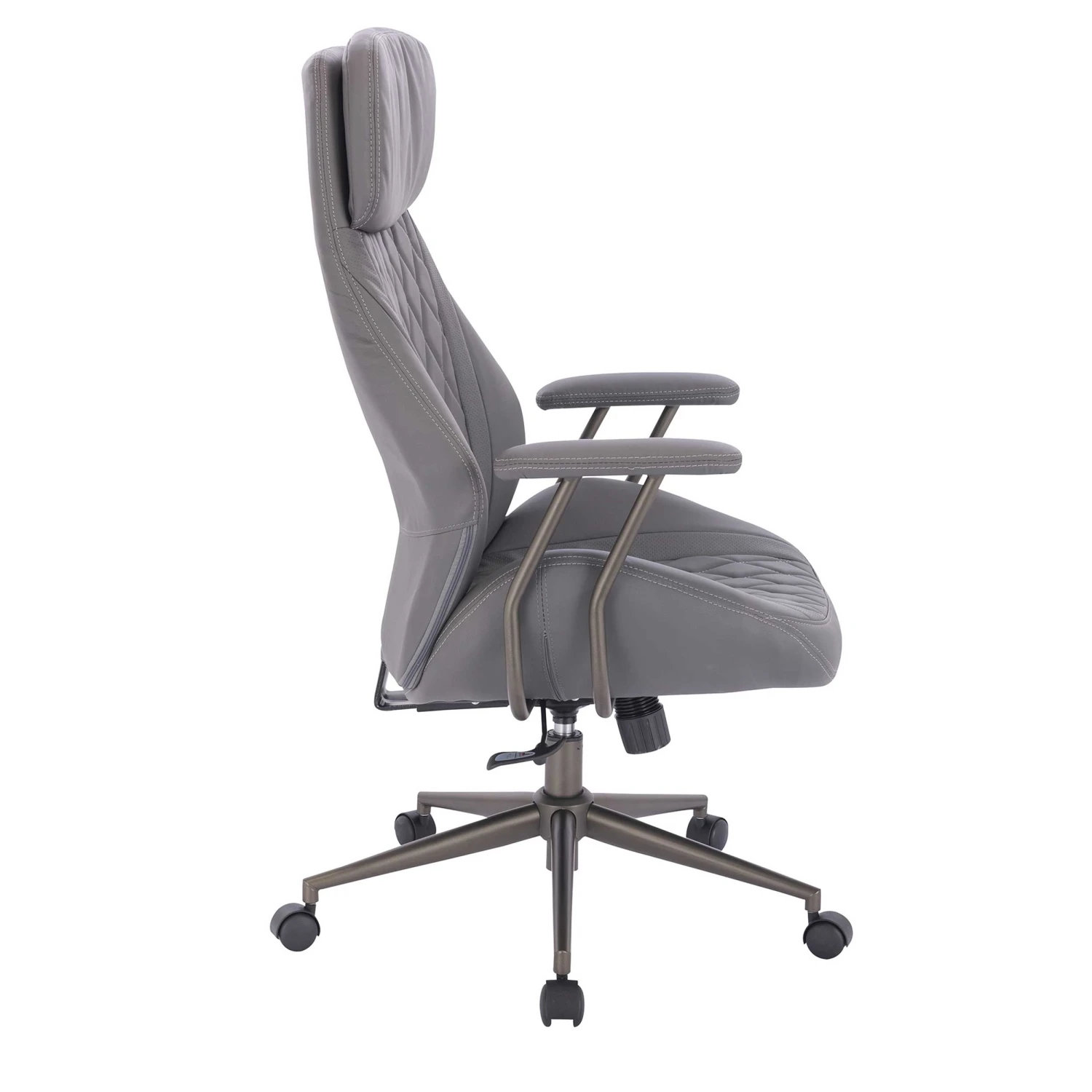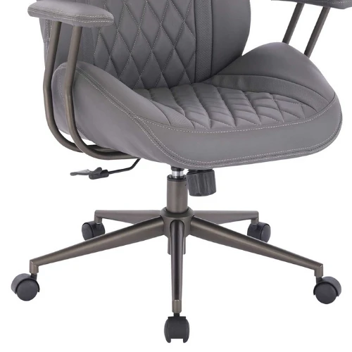 Deze grijze bureaustoel met armleuningen biedt het nodige comfort voor elke werkdag. De zachte zitting en rugleuning in PU zorgen bovendien voor een zakelijke en elegante uitstraling in je kantoor. Wat deze directiestoel speciaal maakt zijn de stiksels die doorlopen over de volledige zitting en leuning. Extra pluspunten: de stoel is in hoogte verstelbaar en kan je makkelijk verschuiven dankzij de metalen voet met vijf wieltjes.