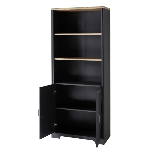 Dossierkast Samine 86x38x204cm met twee deuren. Gemaakt uit spaanplaat in grafietkleur en eikdecor met metalen handgrepen.
