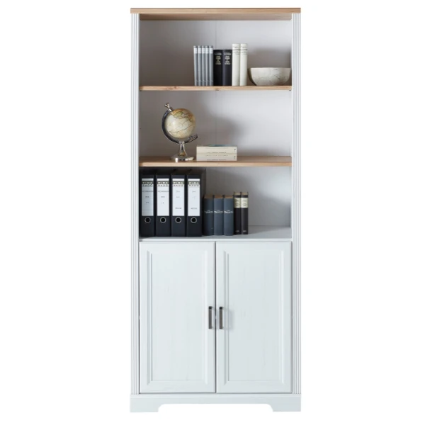 Dossierkast Samine 86x38x204cm met twee deuren. Gemaakt uit spaanplaat in wit en eikdecor met metalen handgrepen.