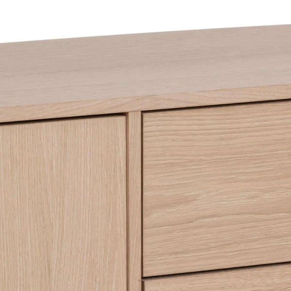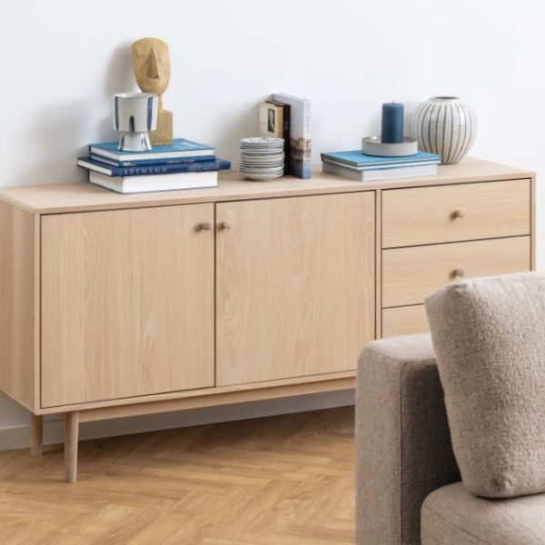 De meubelstukken uit de Aston-collectie passen door hun lichte kleuren en strakke lijnen perfect in een Scandinavisch interieur. Ze zijn gemaakt uit spaanplaat met een decor in witte eik. De lage pootjes (20cm) zijn gemaakt uit eikenhout. Dressoir Aston is voorzien van 2 deuren, 2 legplanken en 3 lades. Er is dus voldoende plaats om je spullen in op te bergen.
