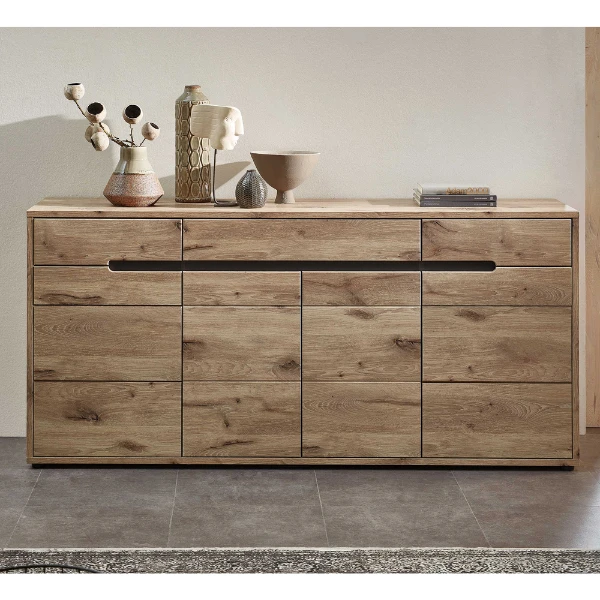 Dressoir Bellini 185x44x87cm uit spaanplaat en MDF. Afwerking in eiklook en antraciet. Met 3 lades en 3 deuren.