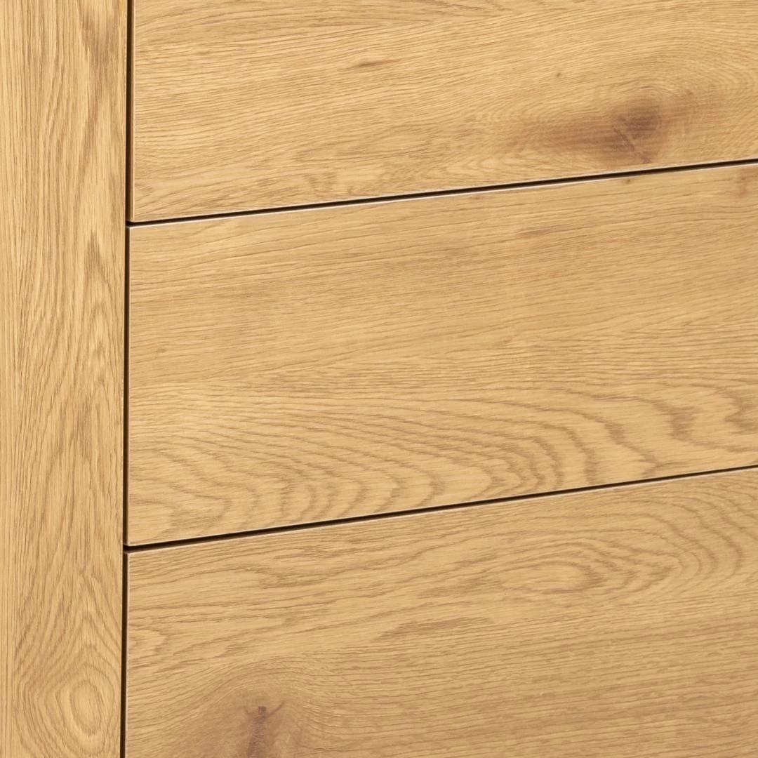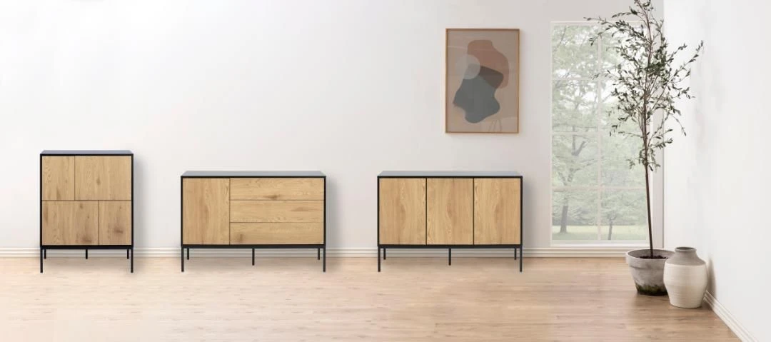 Het Dover Dressoir is geïnspireerd door de industriële stijl dankzij de combinatie van het zwart gepoedercoat metaal en het wilde eikdecor. Dit dressoir is uitgerust met één deur en drie lades. Het leuke aan dit dressoir is dat er geen handvaten aanwezig zijn en het dressoir mooi effen lijkt. Combineer dit dressoir met de andere dressoirs van de Dover-collectie om een mooi geheel te creëren.