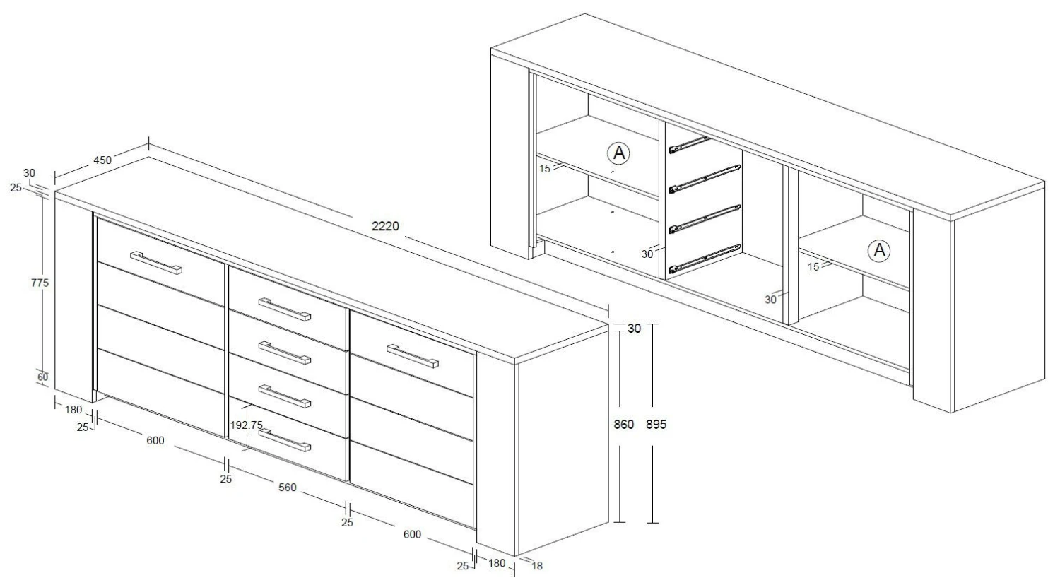 Dressoir Elite 220cm 2 Deuren 4 Lades – Eik