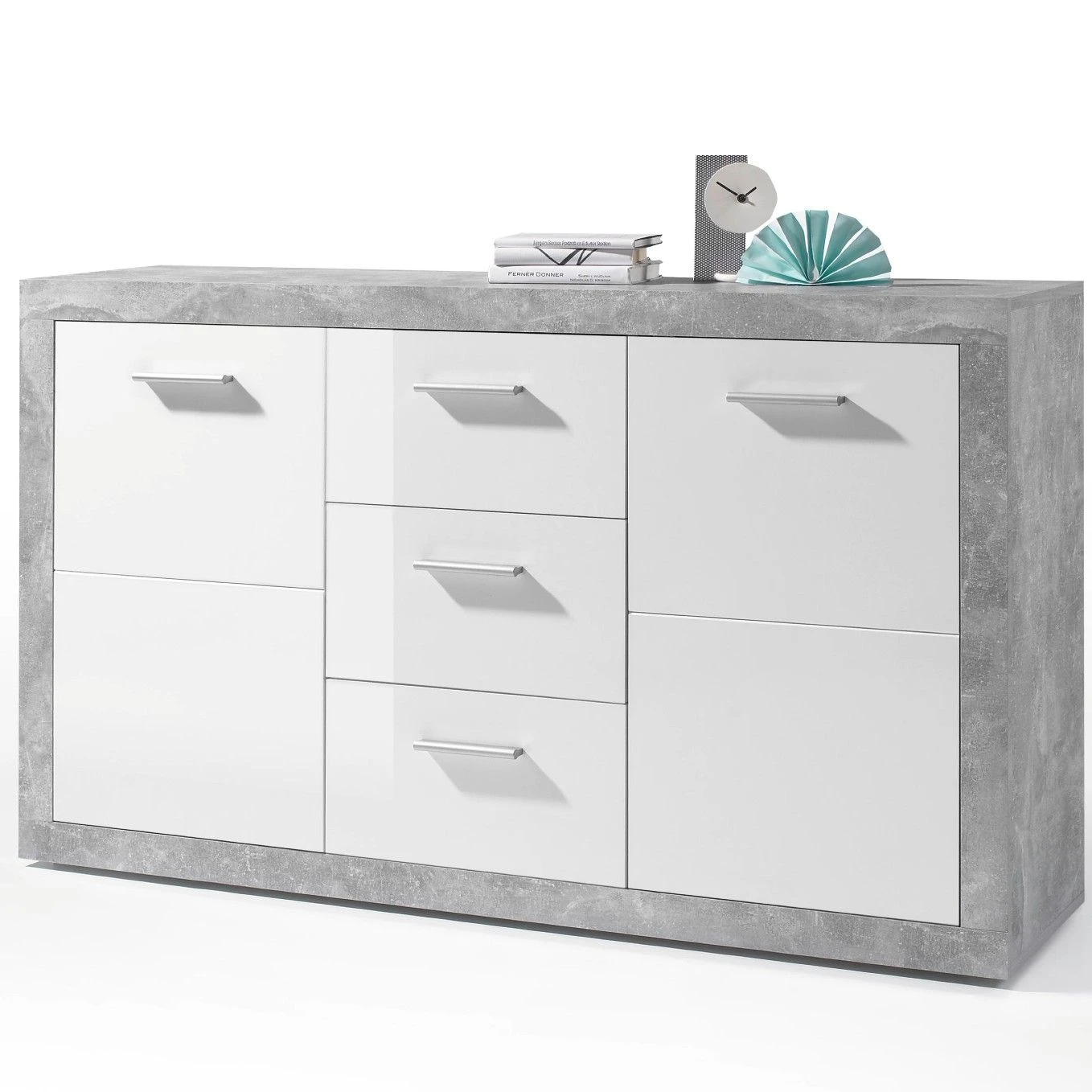 Dressoir Inga, gemaakt uit spaanplaat in betondecor. De 2 deuren en 3 lades zijn wit, elk voorzien van een handgreep in kunststof.