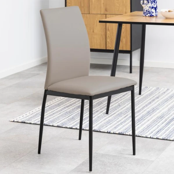 Met hun taupe PU-bekleding en zwarte poten uit gepoedercoat metaal staan de Demir-stoelen prachtig in een modern en minimalistisch interieur. De hoge rugleuning zorgt voor extra comfort.