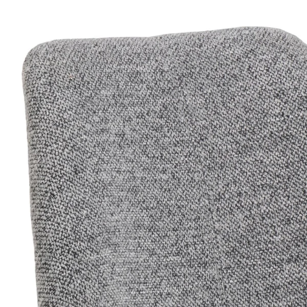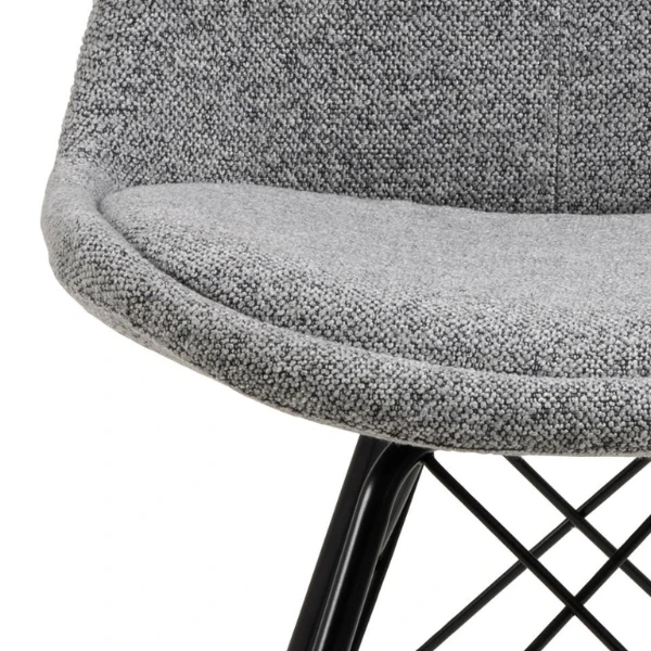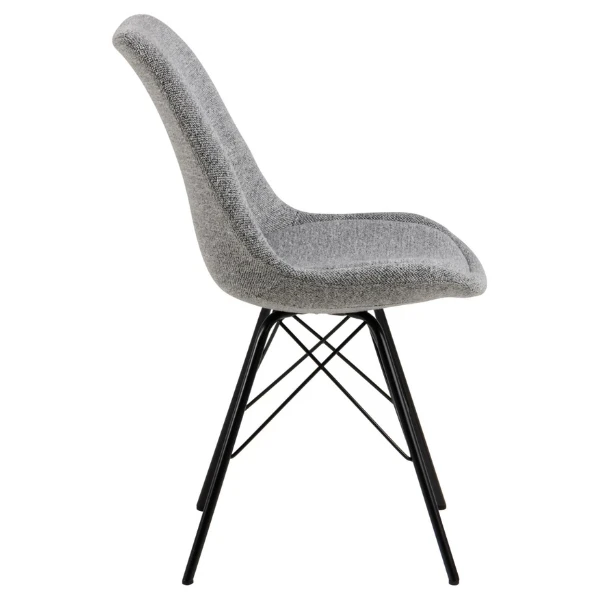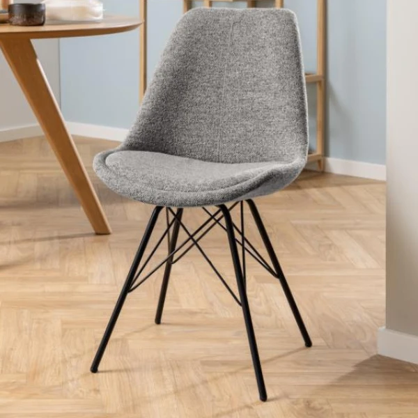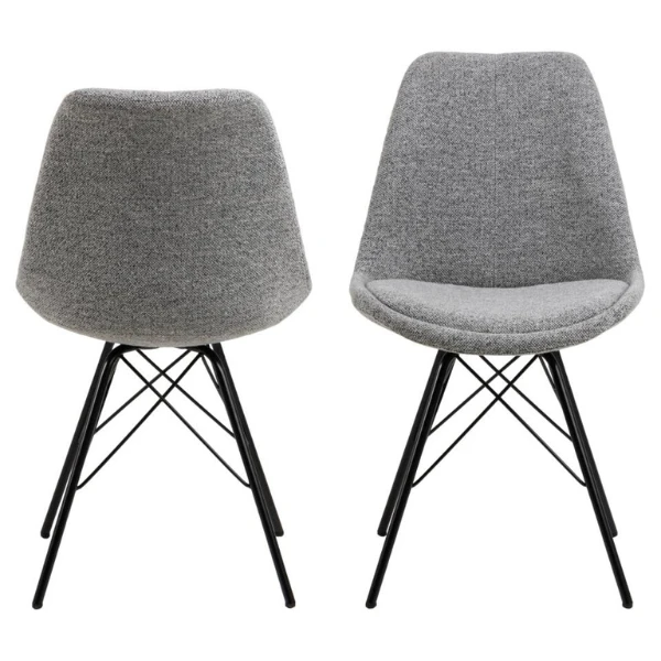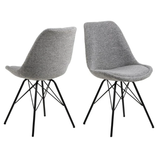 Eetkamerstoel Irma, samengesteld uit lichtgrijze stof en zwarte poten uit gepoedercoat materiaal. Verkocht per 2.