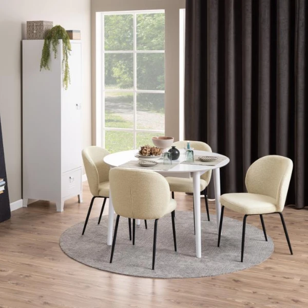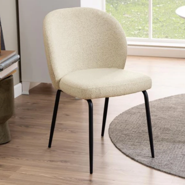Eetkamerstoel Patricia beschikt over een crèmekleurige bekleding uit Monza-stof en poten uit zwart gepoedercoat metaal. Door zijn neutrale kleur en aangename zitvorm kun je met deze stoel zo goed als elk interieur vervolledigen. Naast eetkamerstoel kan deze stoel ook perfect dienstdoen als stoel voor in de slaapkamer, bijvoorbeeld voor aan een make-uptafel. Eetkamerstoel Patricia is ook in een grijze uitvoering beschikbaar.