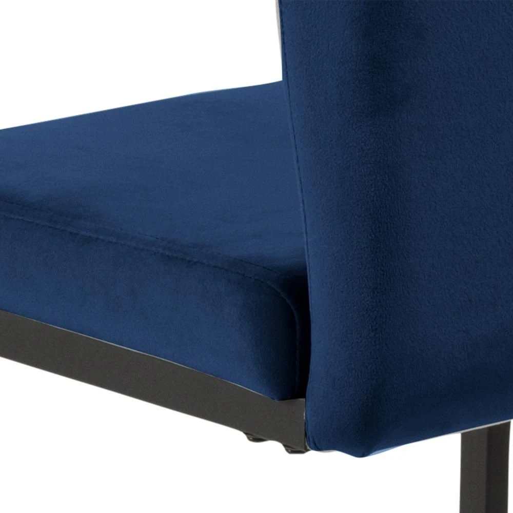 Eetkamerstoel Ulla met donkerblauwe bekleding en zwart gepoedercoate metalen poten. Met hoge rugleuning, handvat en sledepoten.