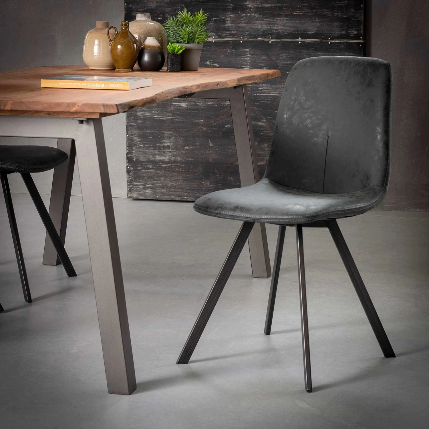 Eetkamerstoel Valentina heeft een zitting in PU, een onderhoudsvriendelijke stoelbekleding in lederlook. De stoel werd behandeld met wax, waardoor de bekleding een oneffen uitstraling krijgt. De bekleding werd netjes afgewerkt met een dubbele stiknaad. Verder heeft de stoel 4 platte poten in vintage staal.