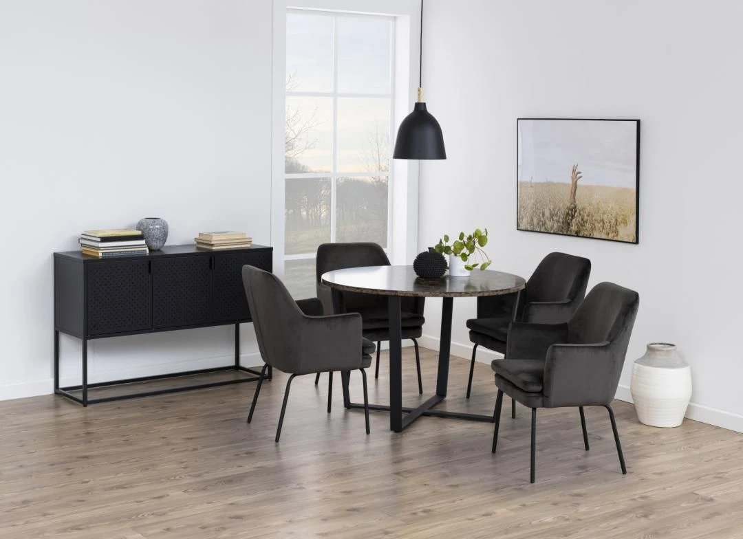 Jouw eetkamer budgetvriendelijk een luxueuze uitstraling geven? Dat doe je met de ronde eettafel Amanda, die met haar bruine marmerlook de ruimte instant meer cachet geeft. Het tafelblad is afgewerkt met een laagje melamine, de matzwarte poten zijn gemaakt van metaal. Met haar diameter van 110 cm biedt ze plaats aan 3 tot 4 personen.