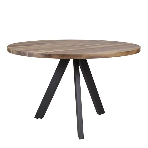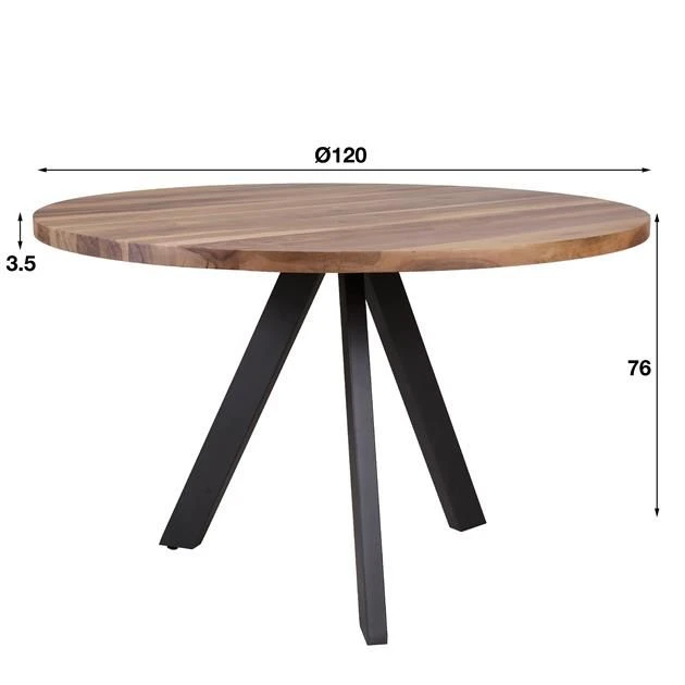 De Dotana-eetkamertafel is gemaakt uit een metalen onderstel afgewerkt met donkergrijze poedercoating. Het ronde tafelblad is gemaakt uit natuurlijk notenhout en beschikt over een diameter van 120 cm. Deze combinatie bezorgt de eettafel meteen een prachtig industriële uitstraling.