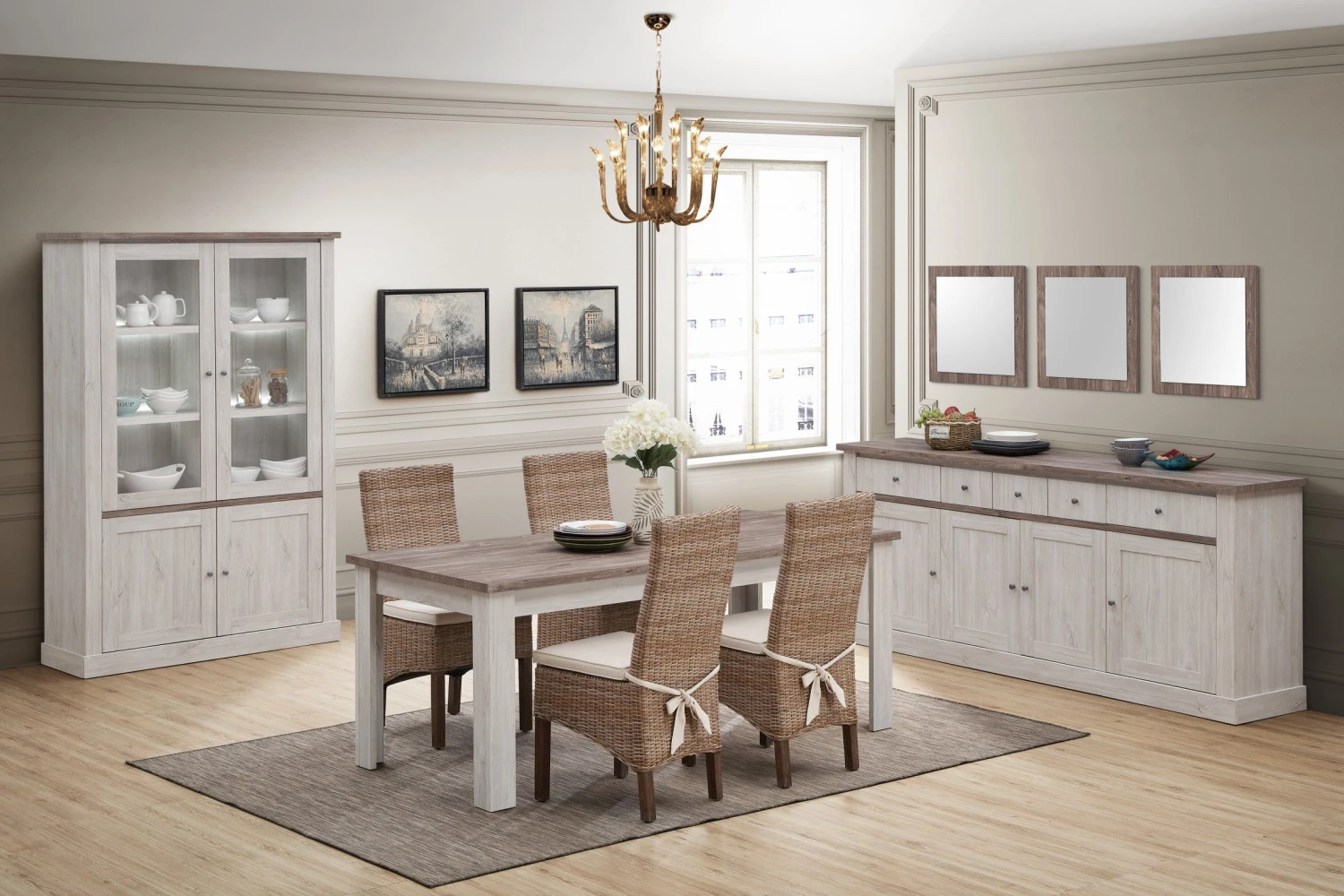 De Elayza meubelen zijn geïnspireerd door de landelijke stijl. Ze zijn gemaakt uit spaanplaat met een decor in witte eik. Deze meubelen beschikken ook over details in grijze eik decor, om enige contrast aan te brengen aan de meubelen.