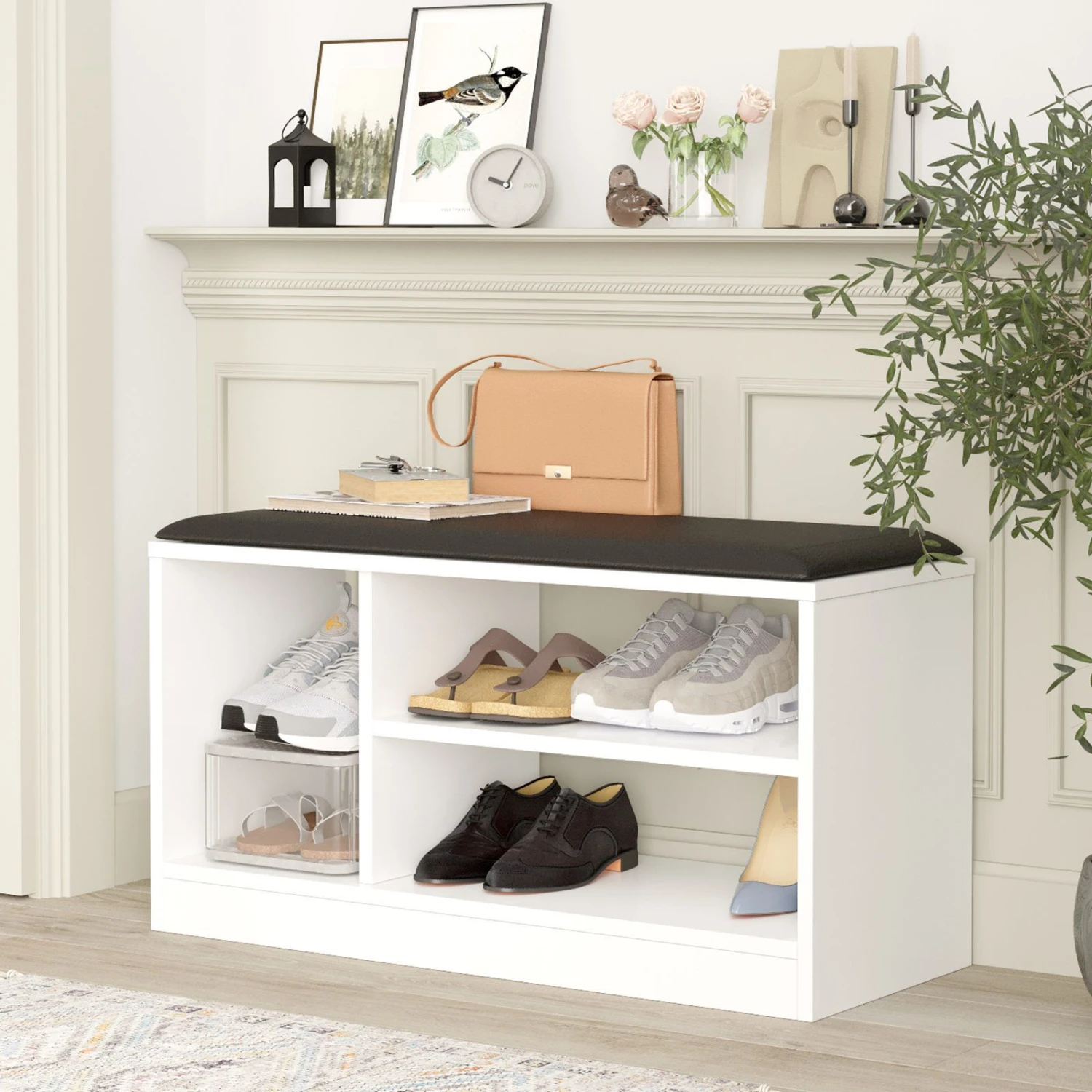 Erika schoenenkast: Stevige 18mm melamine gecoate spaanplaat structuur. Bovenkant versierd met 100% PU leer. Breedte van 89cm en elegante witte kleur