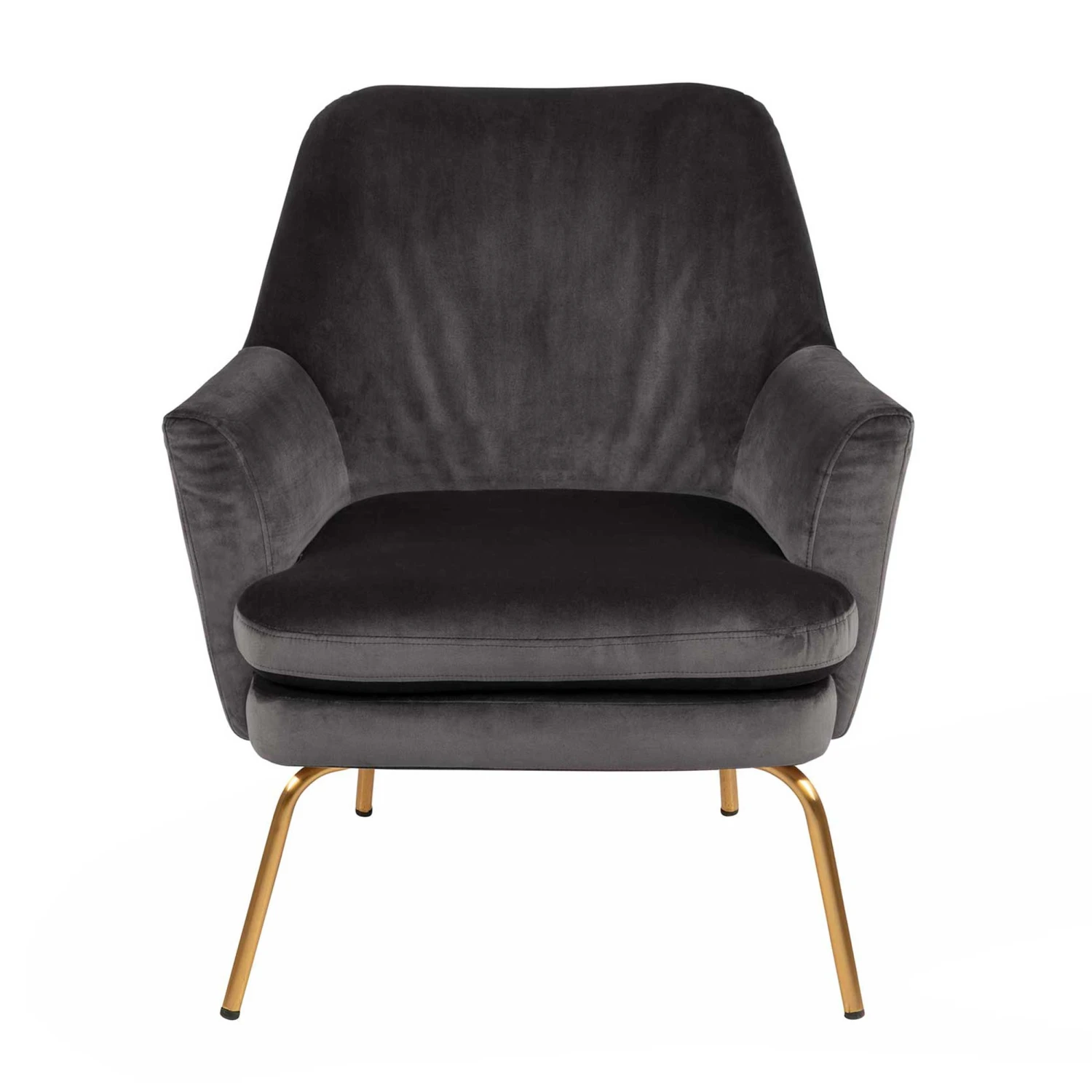 Fauteuil Sari met donkergrijze, fluwelen bekleding en koperkleurige poten.