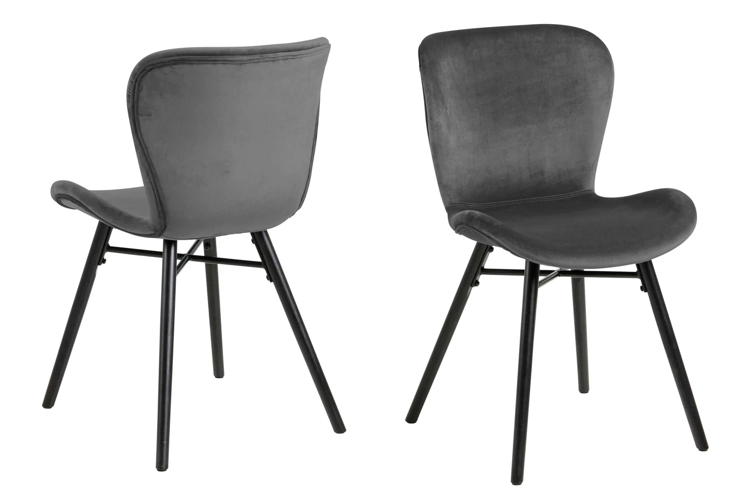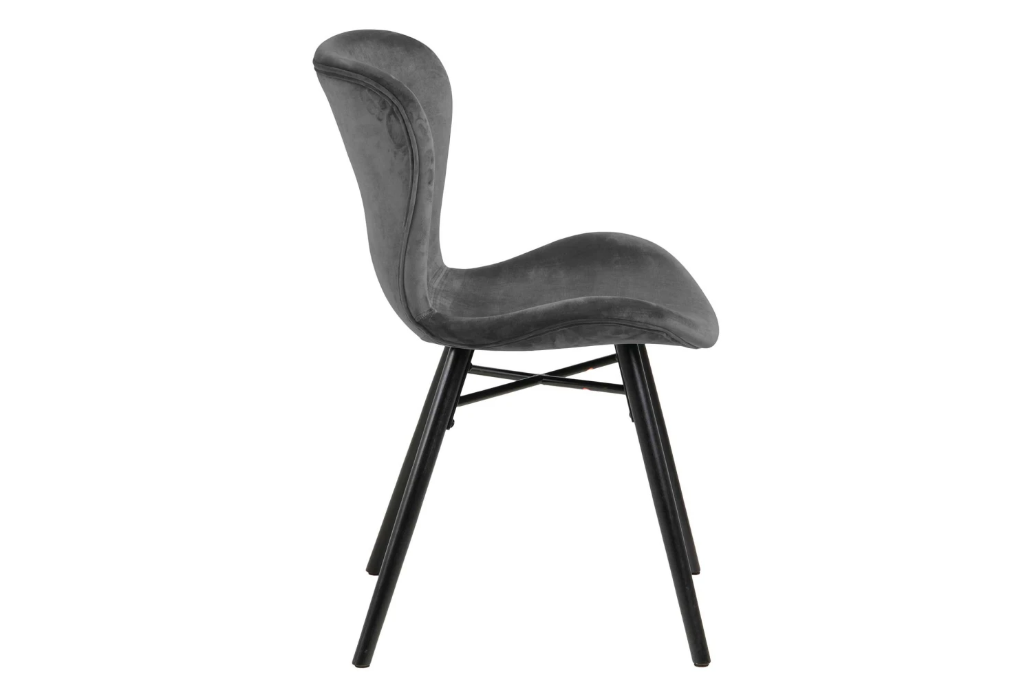 Deze Tilda stoel is bekleed met donkergrijs fluweel en heeft zwartgeverfde poten uit rubberhout verbonden door middel van een zwart, metalen kruis. De comfortabele stoel past perfect in een industrieel chic interieur en wordt standaard geleverd per 2 stuks.