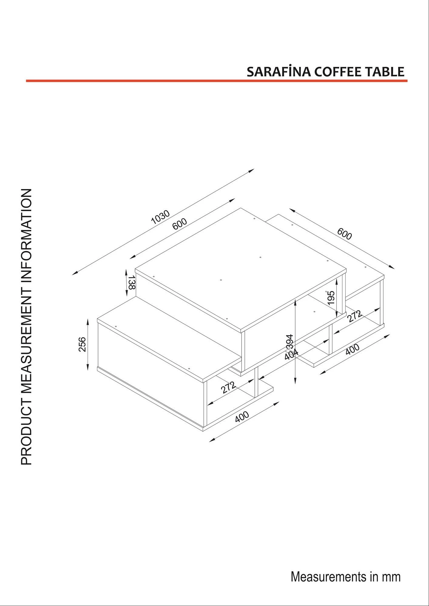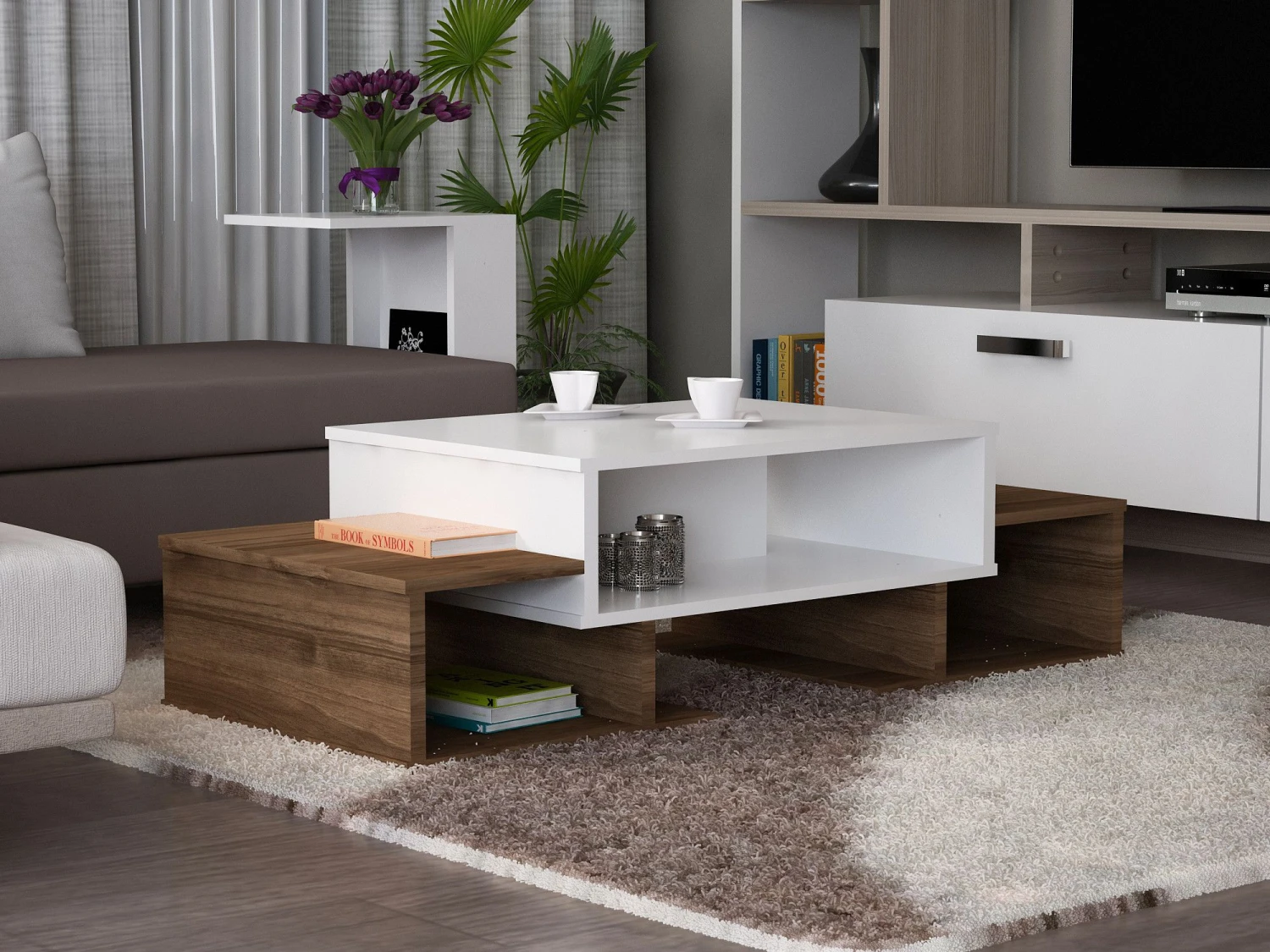 De Furny Home Coffee Table is een stijlvolle toevoeging aan elke woonkamer met zijn 100% melamine gecoate spaanplaat constructie, 18 mm dikte en slanke witte walnoot kleur.