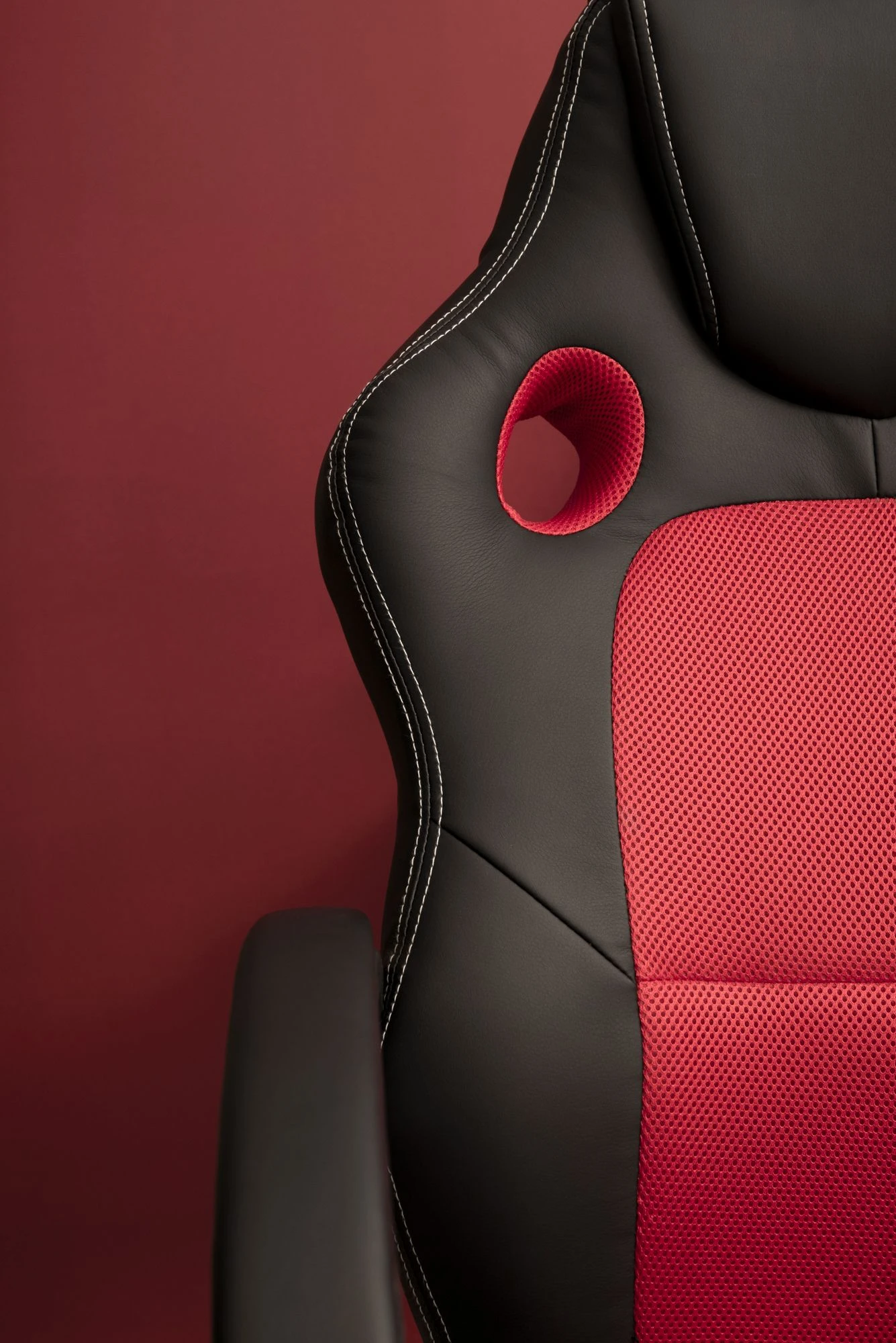 Deze gamestoel beschikt over een stabiel onderstel uit nylon met vijf wielen uit PU. De stoel zelf is gemaakt uit PU met een vulling uit schuim en een zwarte en rode kunstlederen bekleding. Om het comfort te optimaliseren is deze stoel uitgerust met twee armleuningen en kan je deze stoel in hoogte verstellen.