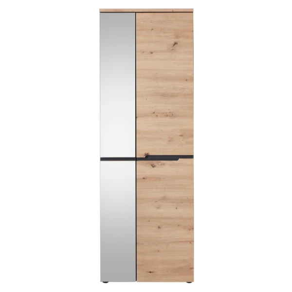 Garderobekast Medina 65x38x192cm uit spaanplaat met afwerking in eiklook. Met twee deuren, waarvan één spiegeldeur.