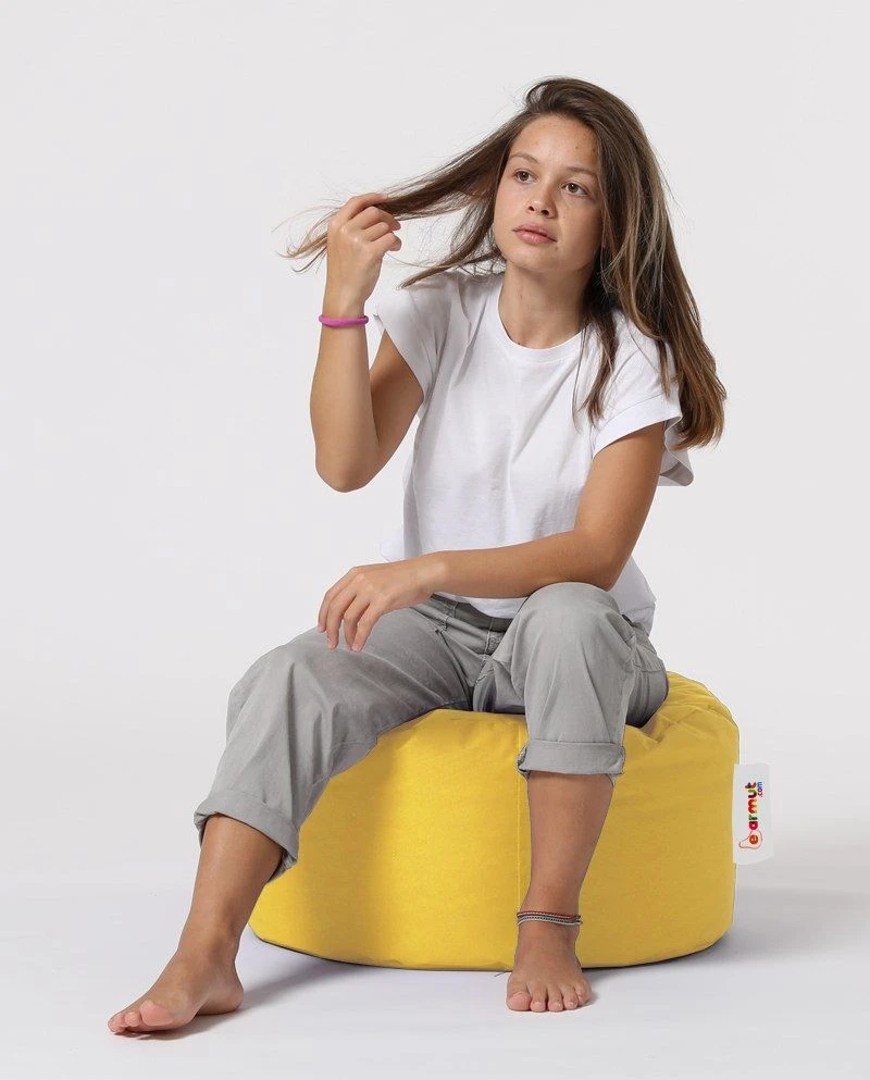 Comfortabele en milieuvriendelijke poef | 100% gerecycled piepschuim met hoge dichtheid | Waterdichte stof | Diameter: 55cm | Hoogte: 30cm | Verborgen ritssysteem | Ongevoerd | Levendig geel