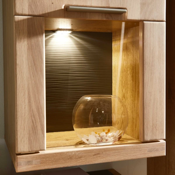 De collectie Blanka valt bij veel mensen in de smaak dankzij hun strakke ontwerp en natuurlijke uitstraling in eikdecor. De antracietkleurige details geven de collectie meer karakter. Dit kastje is gemaakt uit spaanplaat met afwerking in eikdecor. De deur kan zowel links als rechts gemonteerd worden. In de kast zijn twee legplanken voorzien, zodat je ruimte hebt om allerlei zaken netjes op te bergen. Stal je mooiste souvenir uit achter het glas, dankzij de ingebouwde ledverlichting zal deze nog meer tot haar recht komen. Combineer met de andere meubels uit de reeks Blanka en maak van je eet- of woonkamer een mooi geheel.