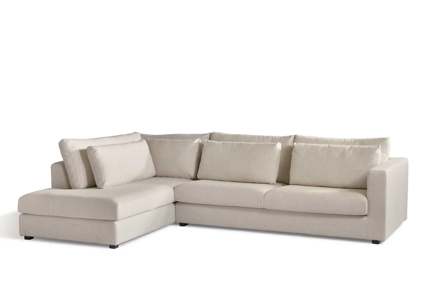 Hoekbank Verita, uitgerust met een longchair aan de linkerkant. Gemaakt uit houtvezelplaten met een bekleding uit beige stof en een vulling uit koudschuim.