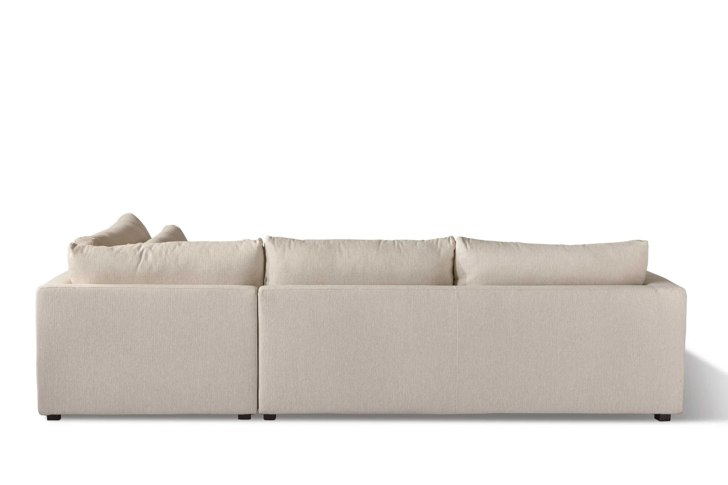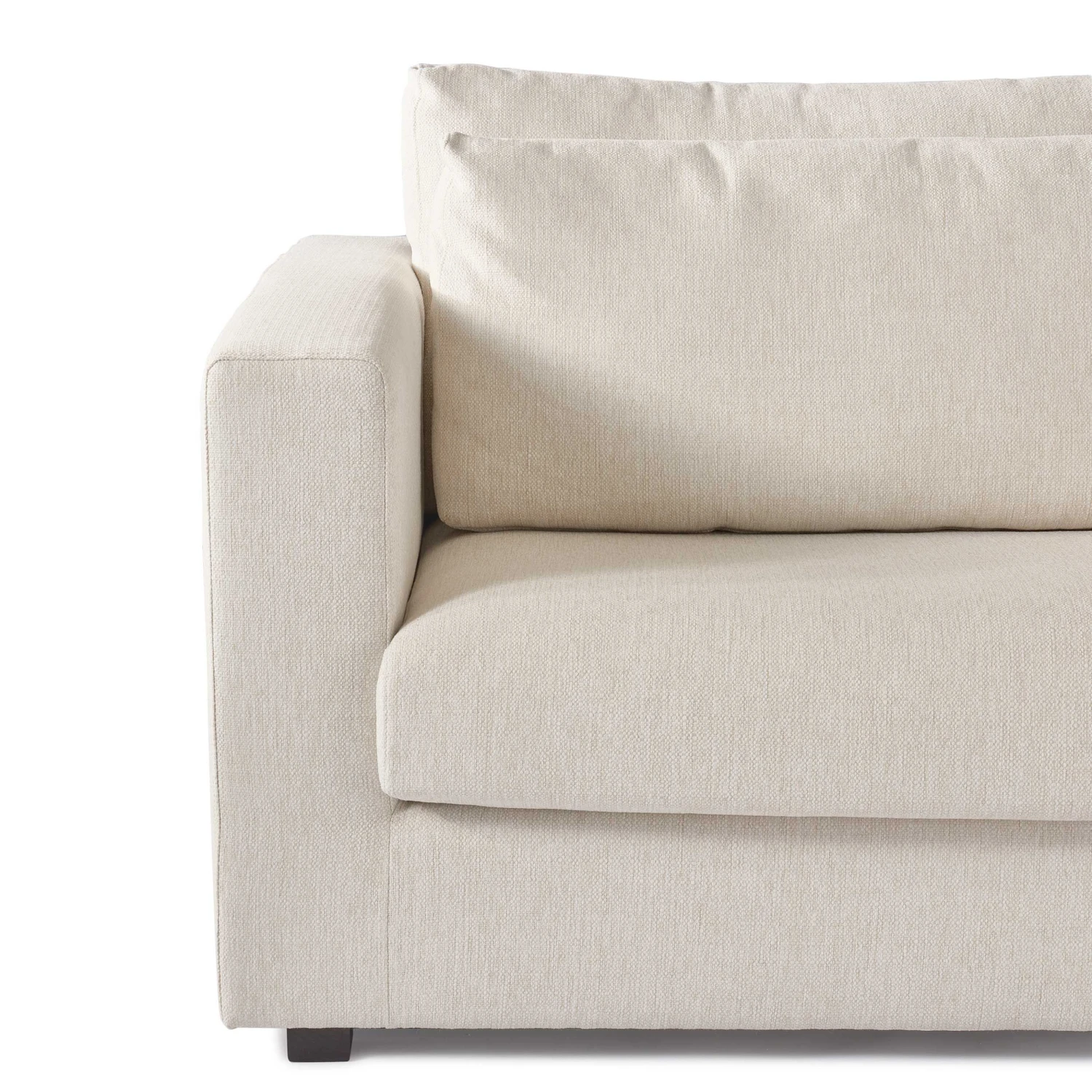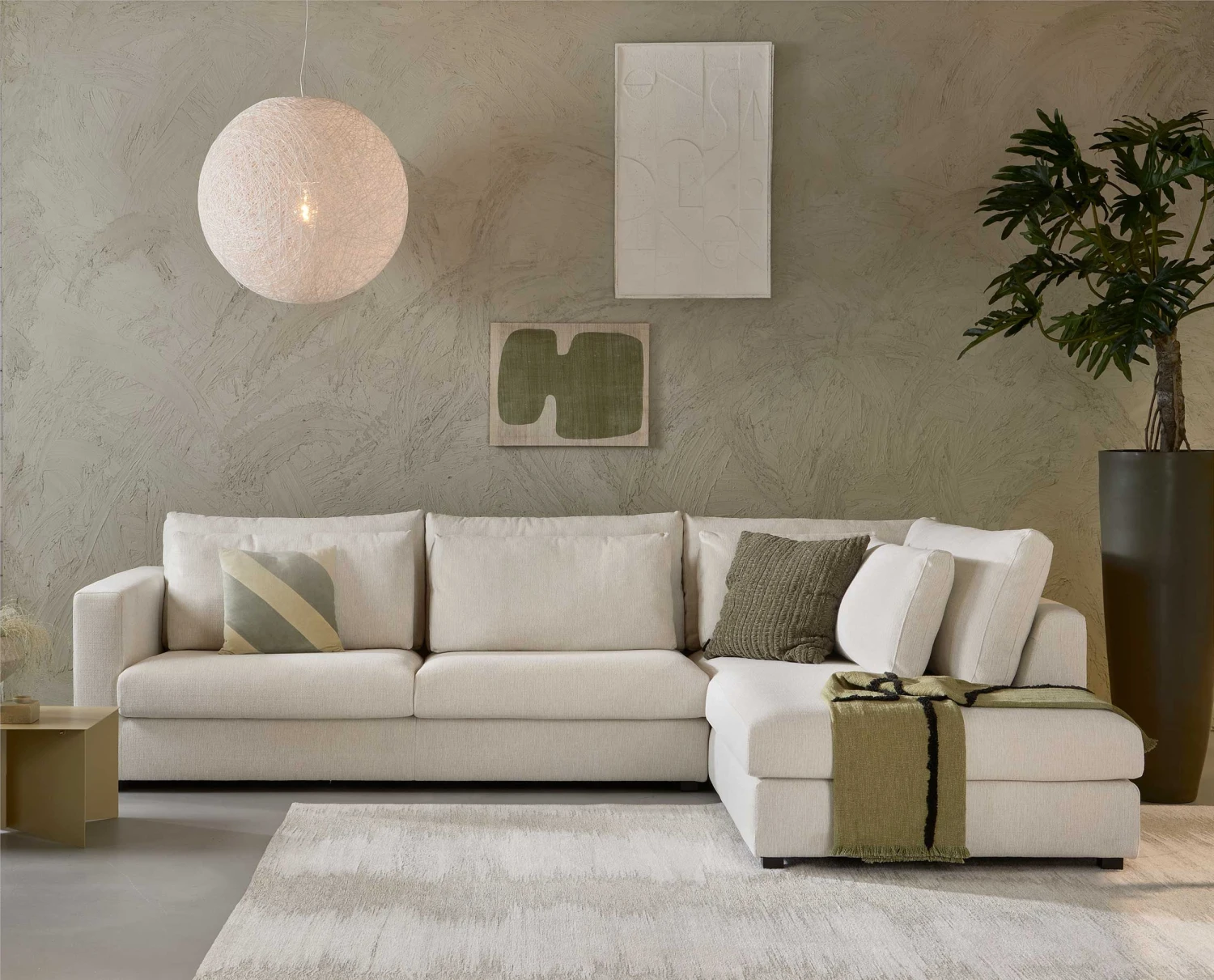 Hoekbank Verita, uitgerust met een longchair aan de rechterkant. Gemaakt uit houtvezelplaten met een bekleding uit beige stof en een vulling uit koudschuim.
